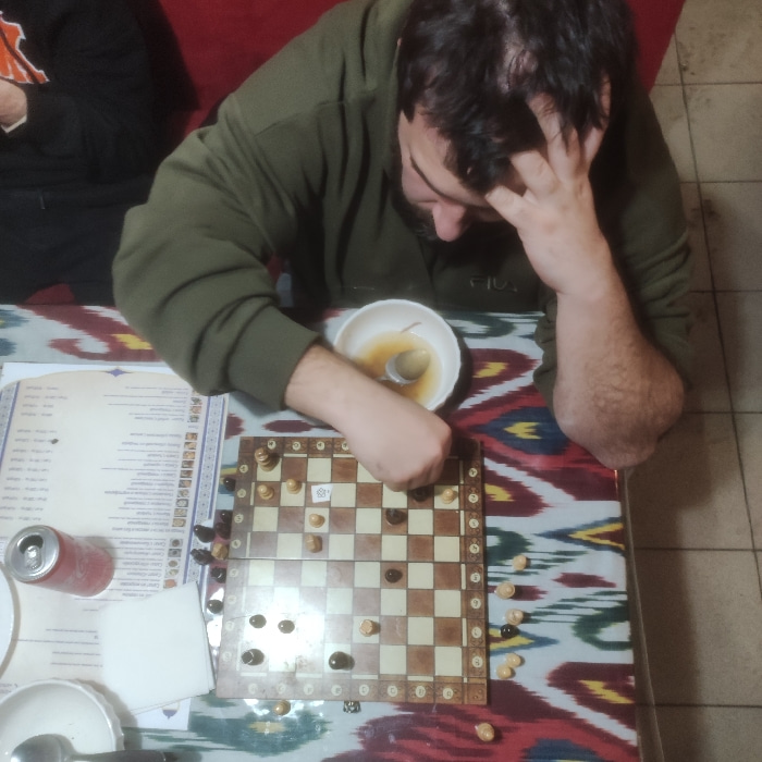 A man with dark hair and a beard wearing a green shirt sits at a table. He looks down at a chessboard, holding his head in his hand. A bowl with a spoon sits beside the board. Chess pieces are scatter…read more