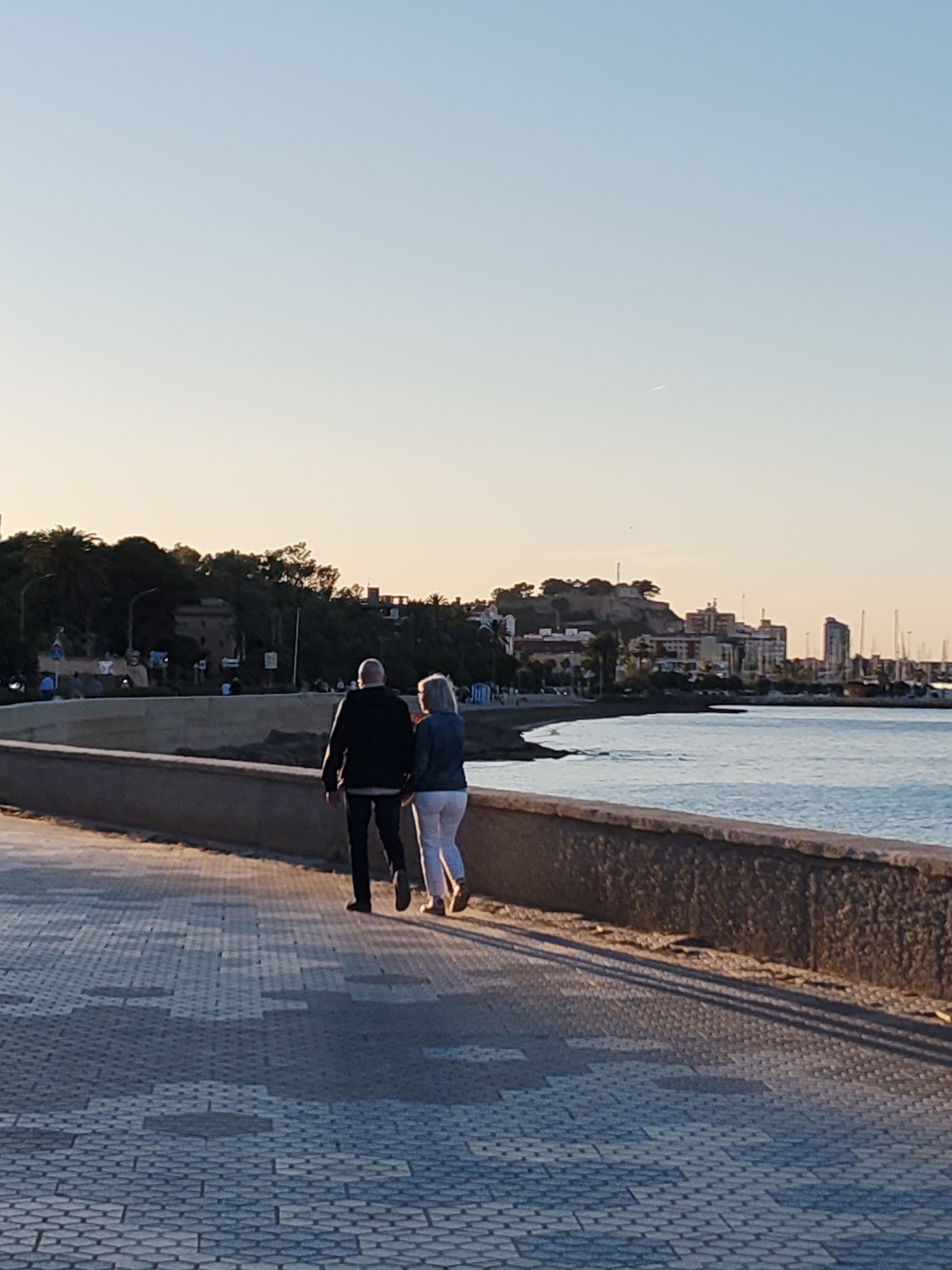 The image depicts two individuals, an adult man and woman, walking away from the viewer along a paved promenade. The man, on the left, wears a dark jacket, dark trousers, and dark shoes, while the wom…read more