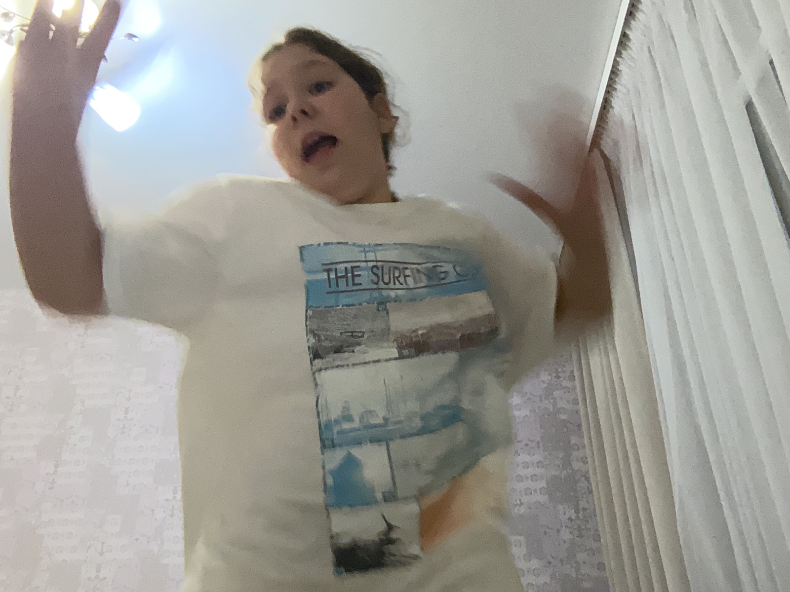 A person is looking down at the camera. They are wearing a white t-shirt with an image on the front. The background is a light-colored wall and curtains. The location is an interior setting.