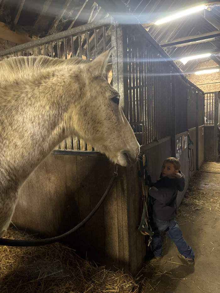 An indoor photograph captures an intimate moment between a boy and a horse within a stable or barn, in Estaimpuis, Belgium. The perspective is from inside a horse stall, looking upwards and towards an…read more