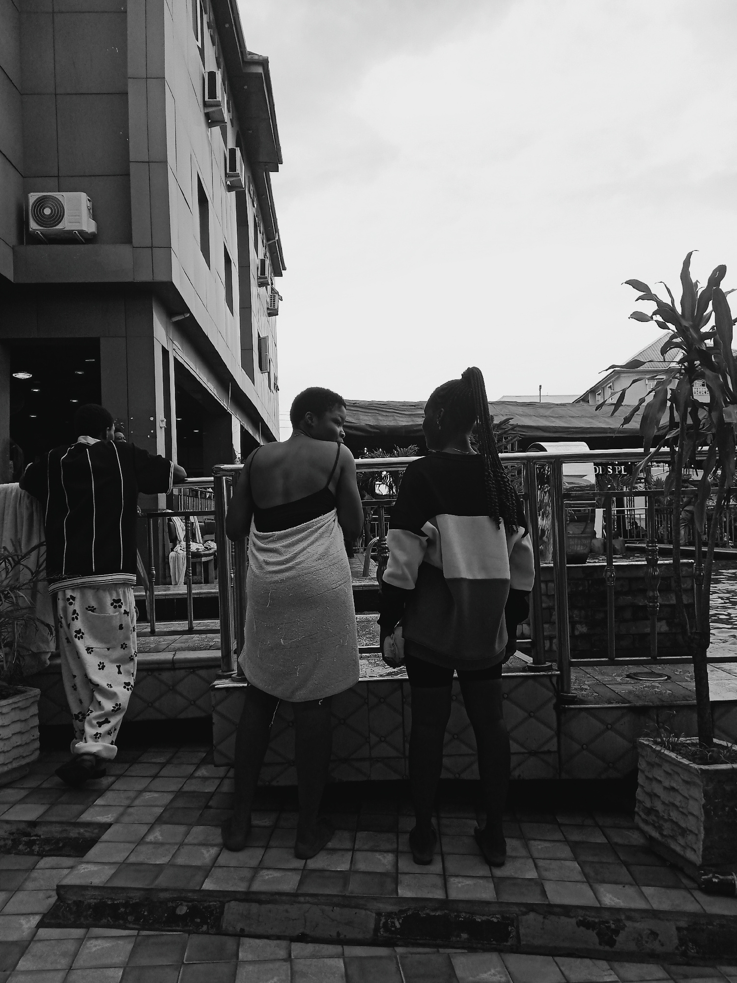 The image, in black and white, shows three individuals standing near a railing overlooking a pool or water feature in Onitsha, Nigeria. A man is visible on the left, wearing a vertically striped top a…read more