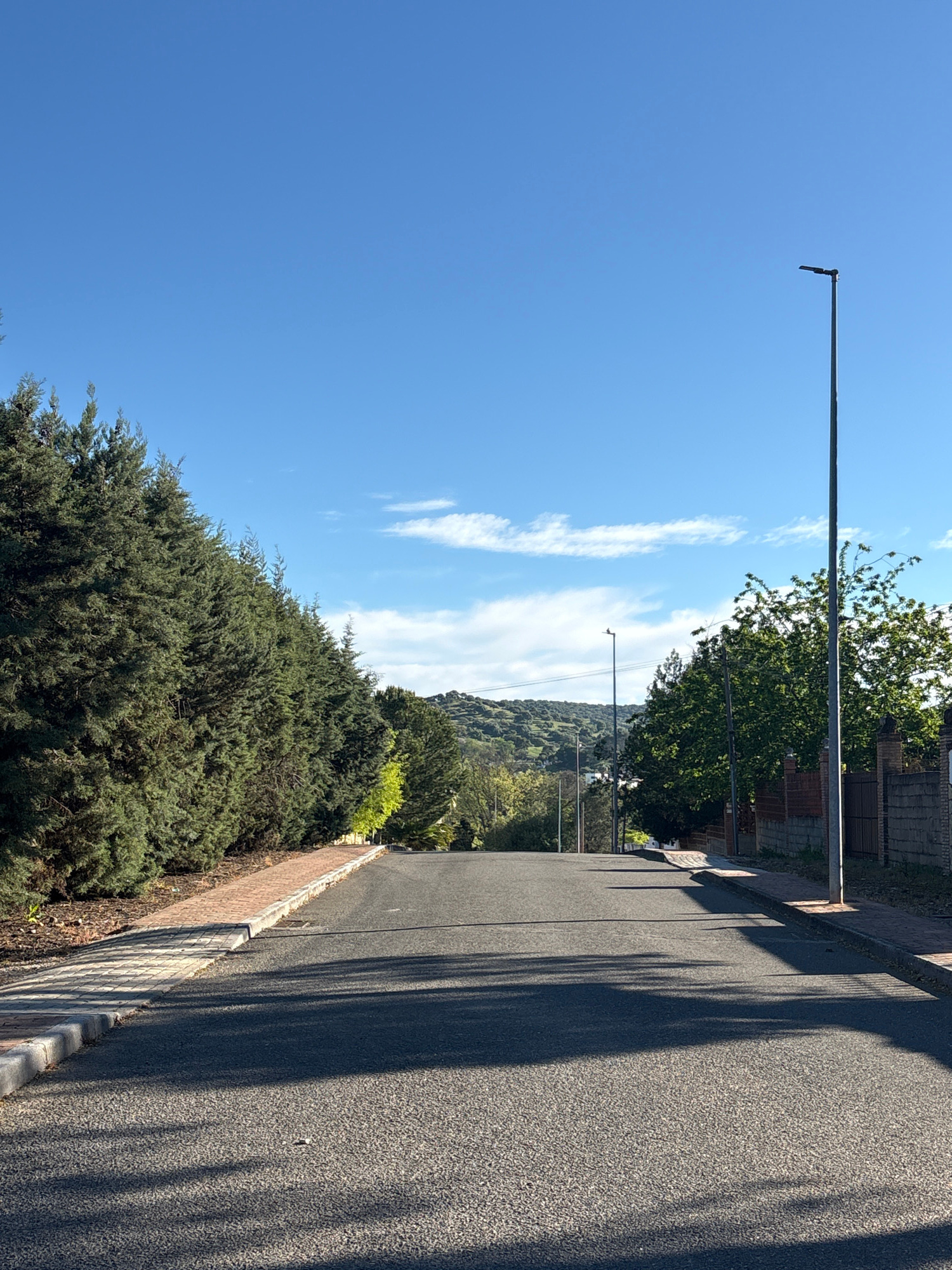 The image captures a street scene in Urbanización Encinares De Alcolea, Spain. The perspective is from street level, looking down the road. The road surface is asphalt. On the right, a wall is visible…read more