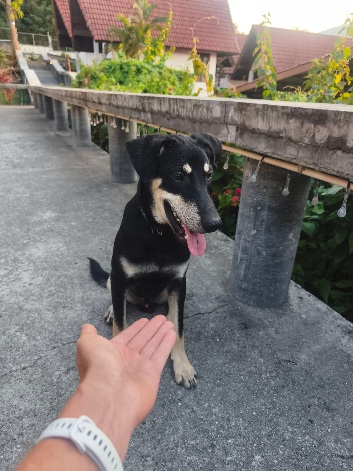A medium-sized dog with black fur and tan markings sits on a concrete walkway in บ้านบางรักษ์, Thailand. The dog is panting and has its tongue sticking out. A person's left hand is outstretched toward…read more