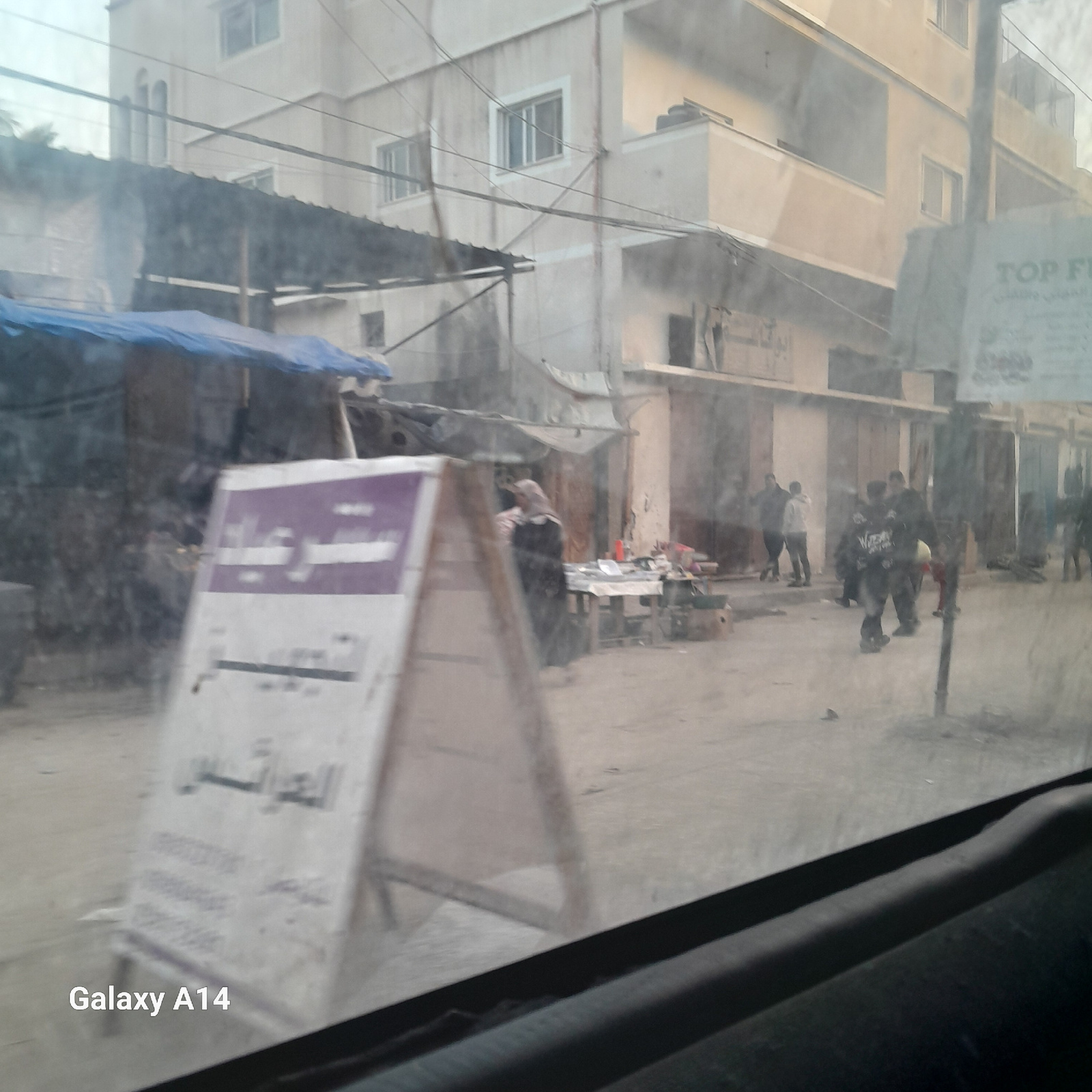 The image depicts a street scene in Deir el-Balah, Palestinian Territory, taken from inside a vehicle, likely through a window. Buildings line the street, with a structure appearing to be under constr…read more