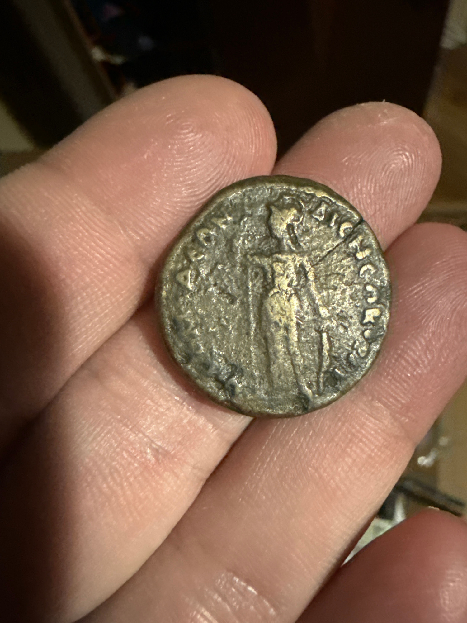 A close-up image captures a person's hand holding a single, dark-colored coin. The hand is positioned so that the coin rests on the fingertips and palm, allowing for a clear view of its obverse (or re…read more