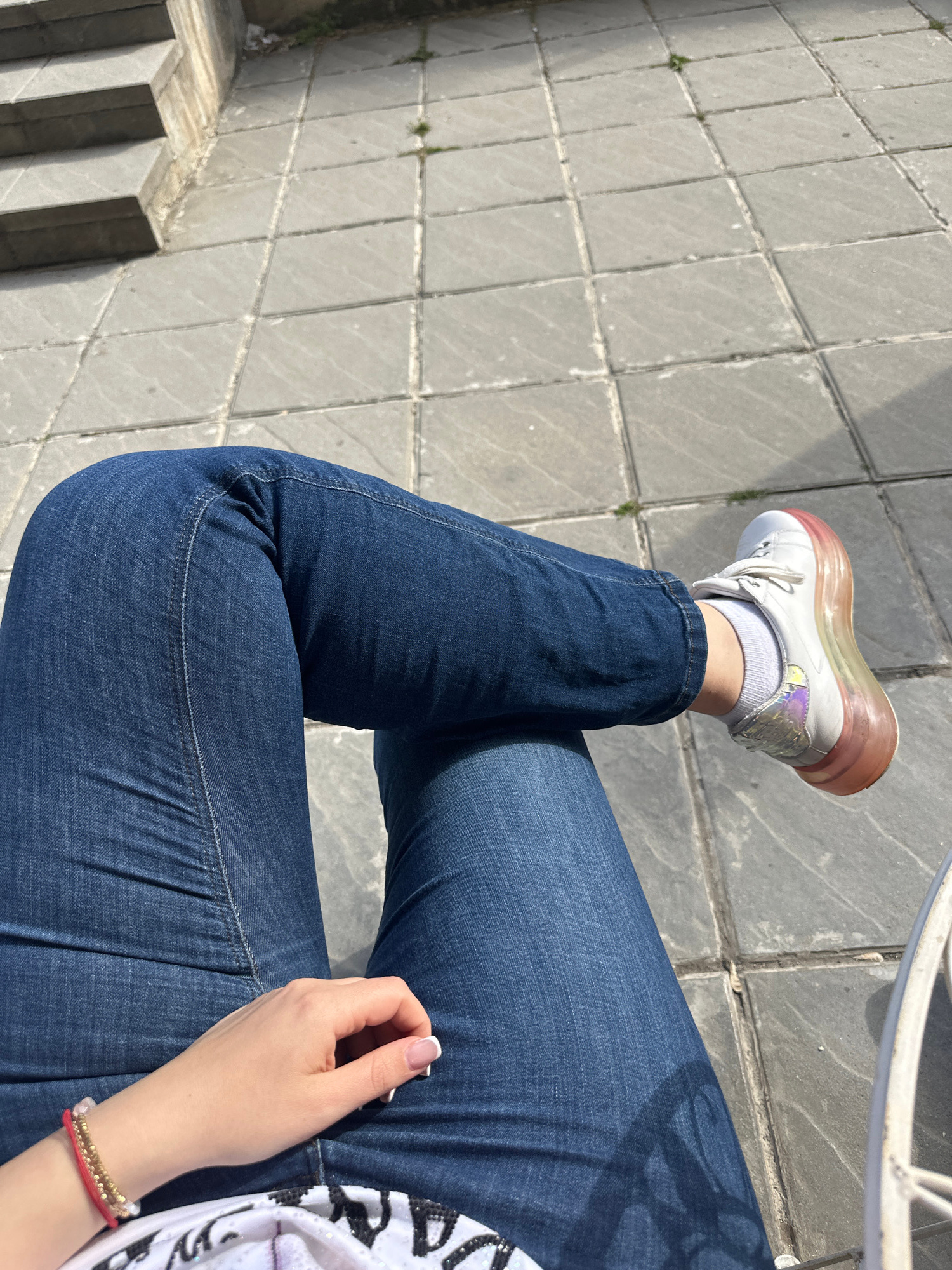 The image captures a top-down view of a person seated outdoors, primarily showing their legs, one arm, and a hand. The person is wearing dark blue denim jeans, white ankle socks, and white athletic sh…read more