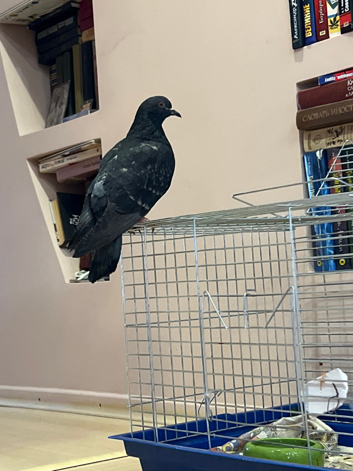 The scene depicts an interior room in the city of Odesa, Ukraine. A dark-feathered rock pigeon (Columba livia), with reddish eyes and a black beak, is perched facing right in profile on the top wire m…read more