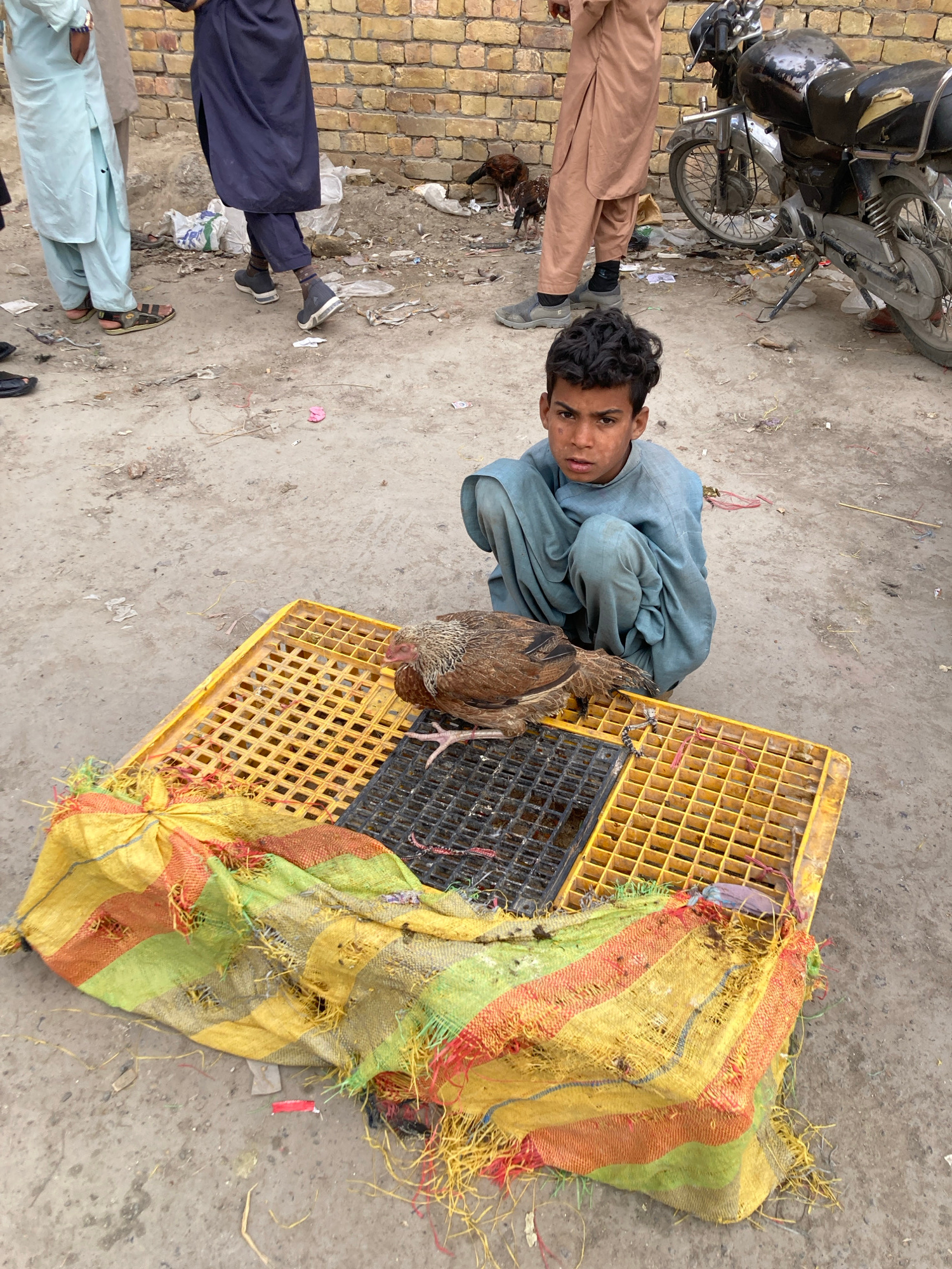 A boy in a light blue shalwar kameez crouches next to a yellow and black plastic crate containing a brown chicken in what appears to be a street setting in Quetta City Tehsil, Pakistan. The crate is p…read more