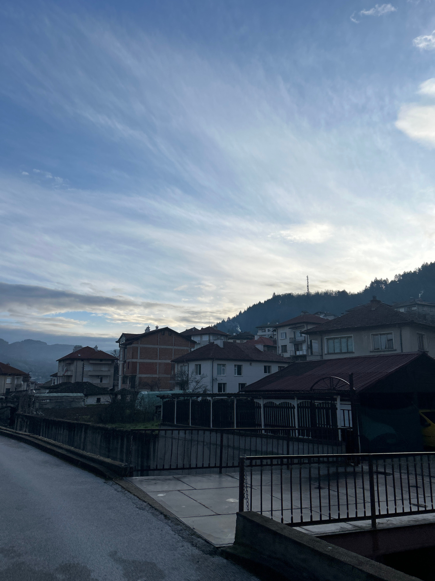 The image shows a view in Zlatograd, Bulgaria, looking towards a hillside with buildings nestled along its slope. The sky is filled with streaky clouds. In the foreground is a street with a retaining…read more