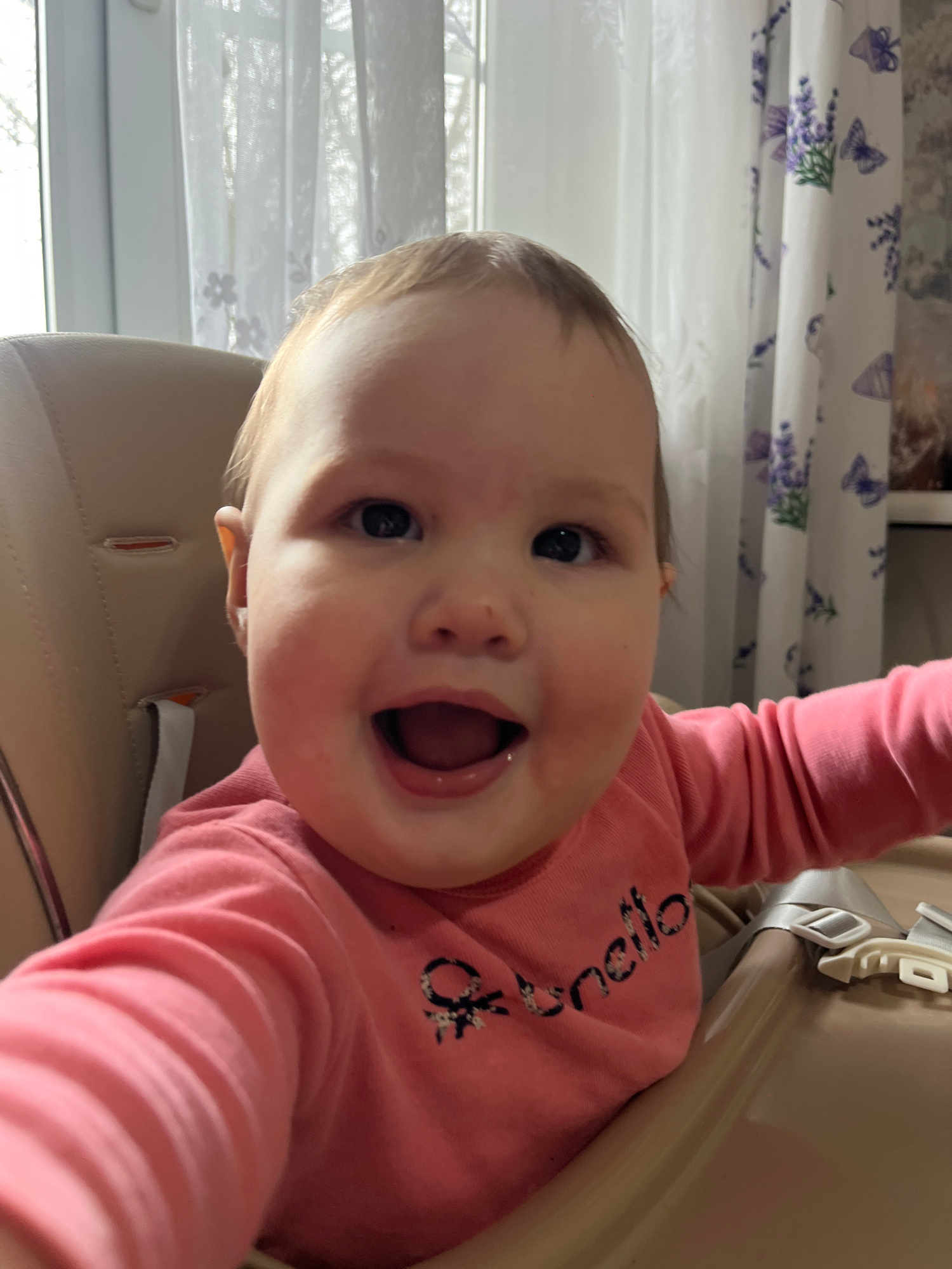 A baby with fair skin, seated in a high chair, is the central subject of the image. The baby is wearing a long-sleeved pink shirt with a design on the chest. The baby's mouth is open, appearing to be…read more