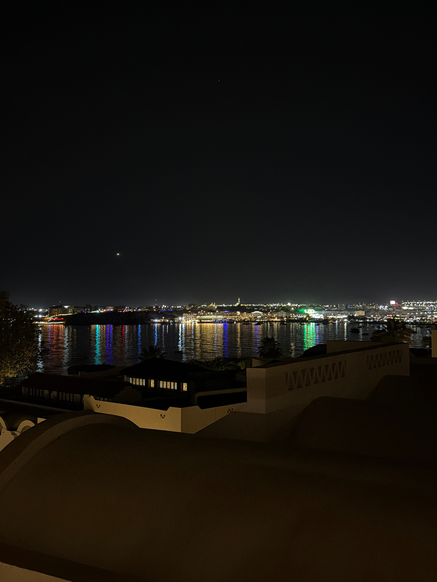 The image depicts a nighttime cityscape with water in the foreground, likely taken from a balcony or elevated position. The city lights are reflected in the water, creating streaks of various colors i…read more