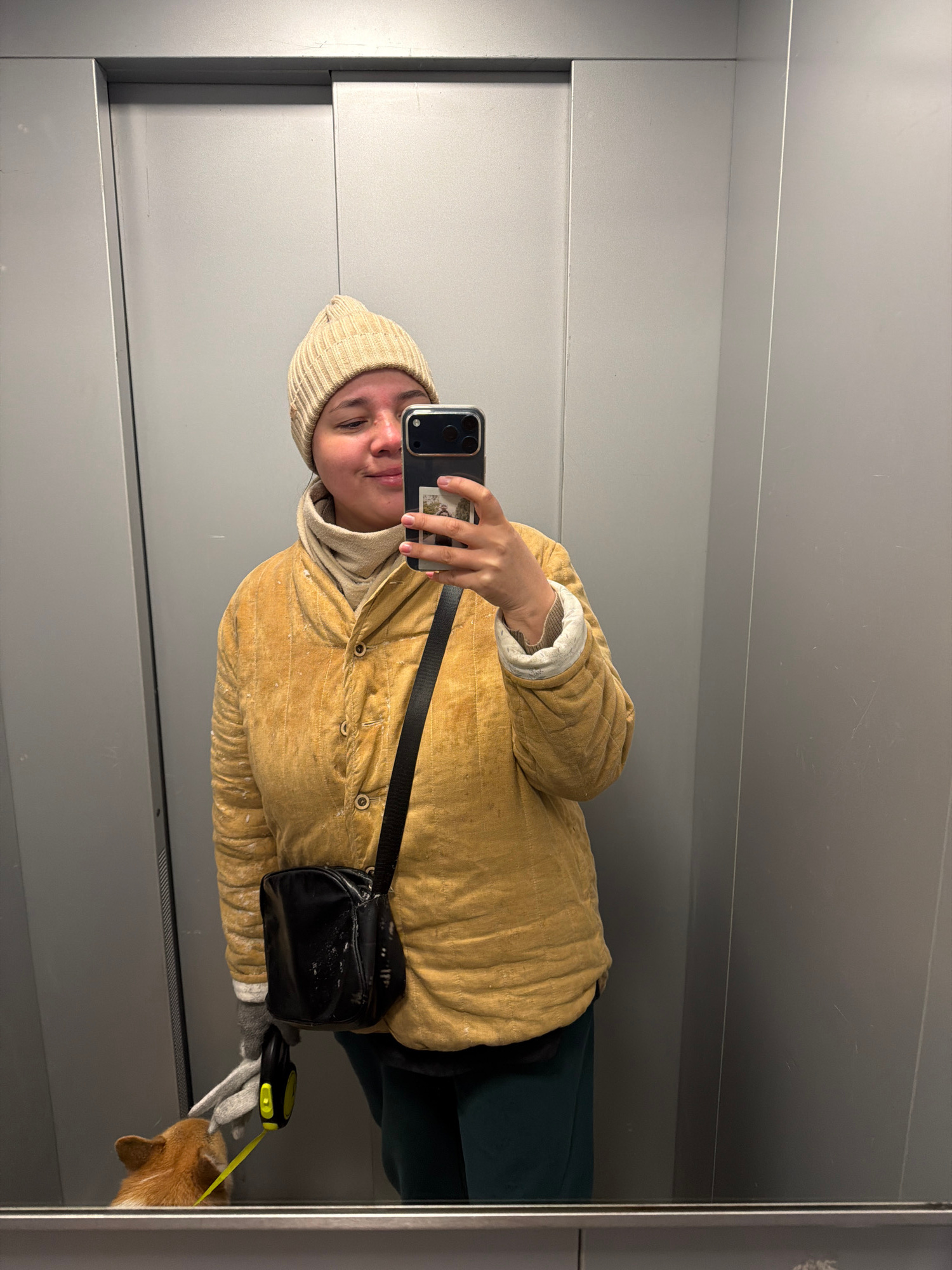 A person wearing a beige beanie and a yellow quilted jacket with a black shoulder bag is taking a selfie in what appears to be an elevator. A dog's head is visible at the bottom right, with a retracta…read more