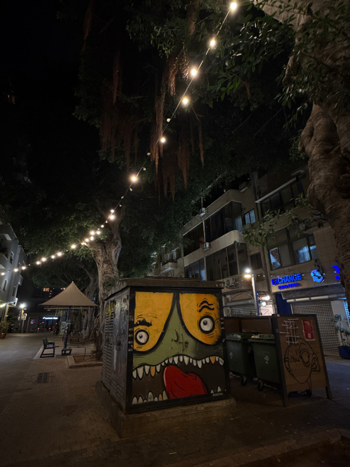 Night scene of a street decorated with string lights spanning from left to right across trees. Buildings flank the sides of the street, including one displaying "CHANGE". Graffiti art adorns boxes alo…read more