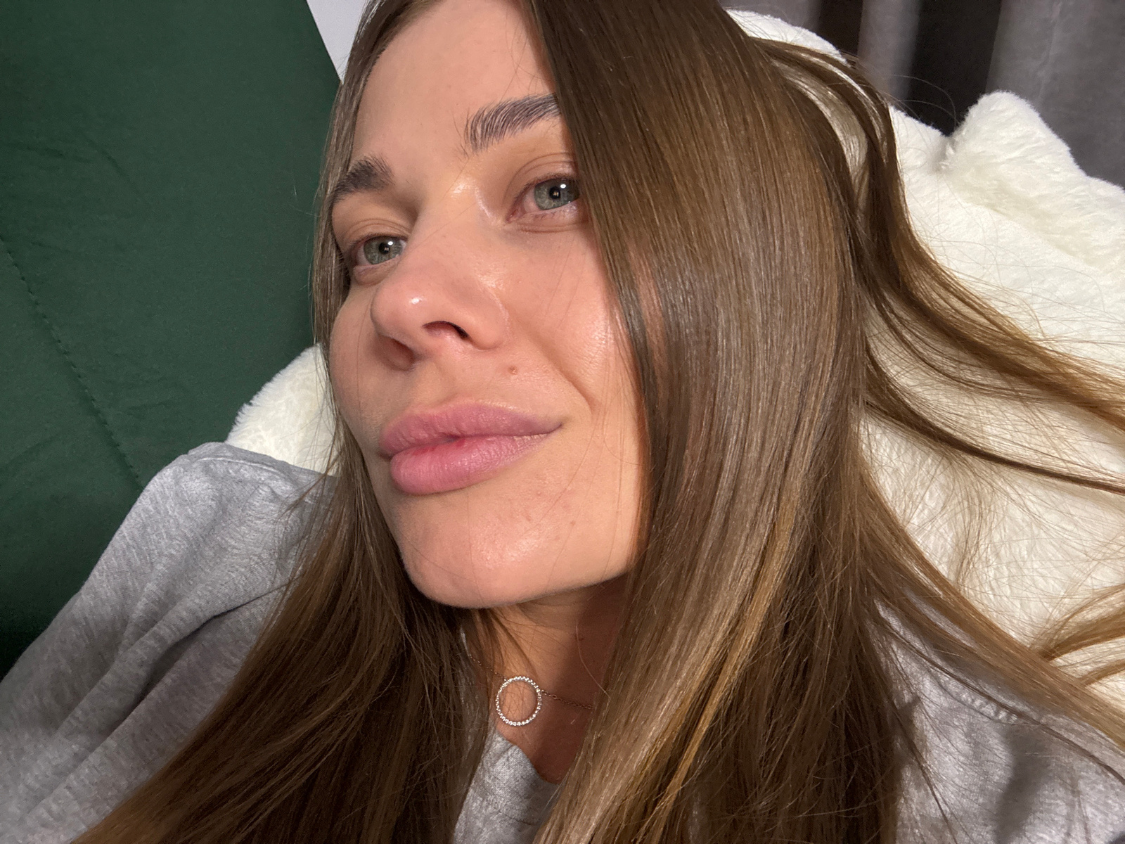 A woman with light brown hair is lying down. The image is taken from an inverted perspective, with her face central and close to the camera. Her hair is spread around her head, and she appears to be w…read more