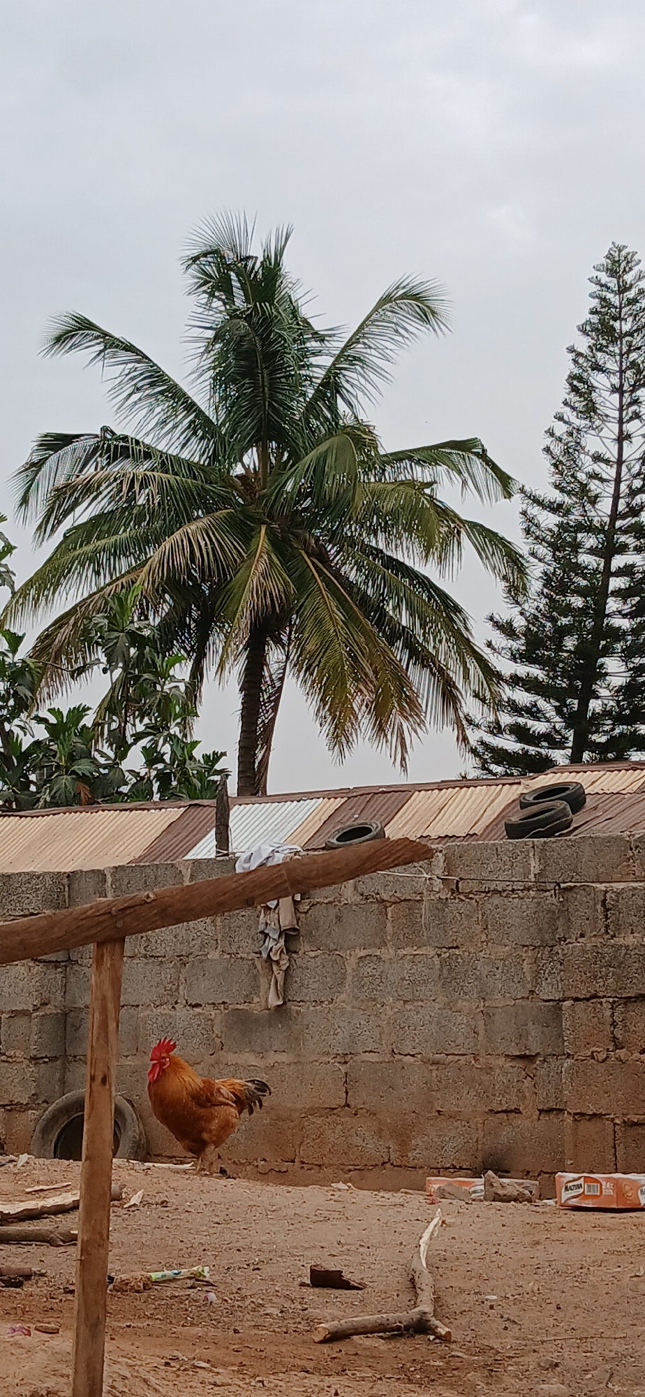The image, presumably taken in Shaba, Nigeria, depicts a landscape containing both natural and man-made elements. A tall coconut palm dominates the left of the frame, its fronds reaching towards a gra…read more