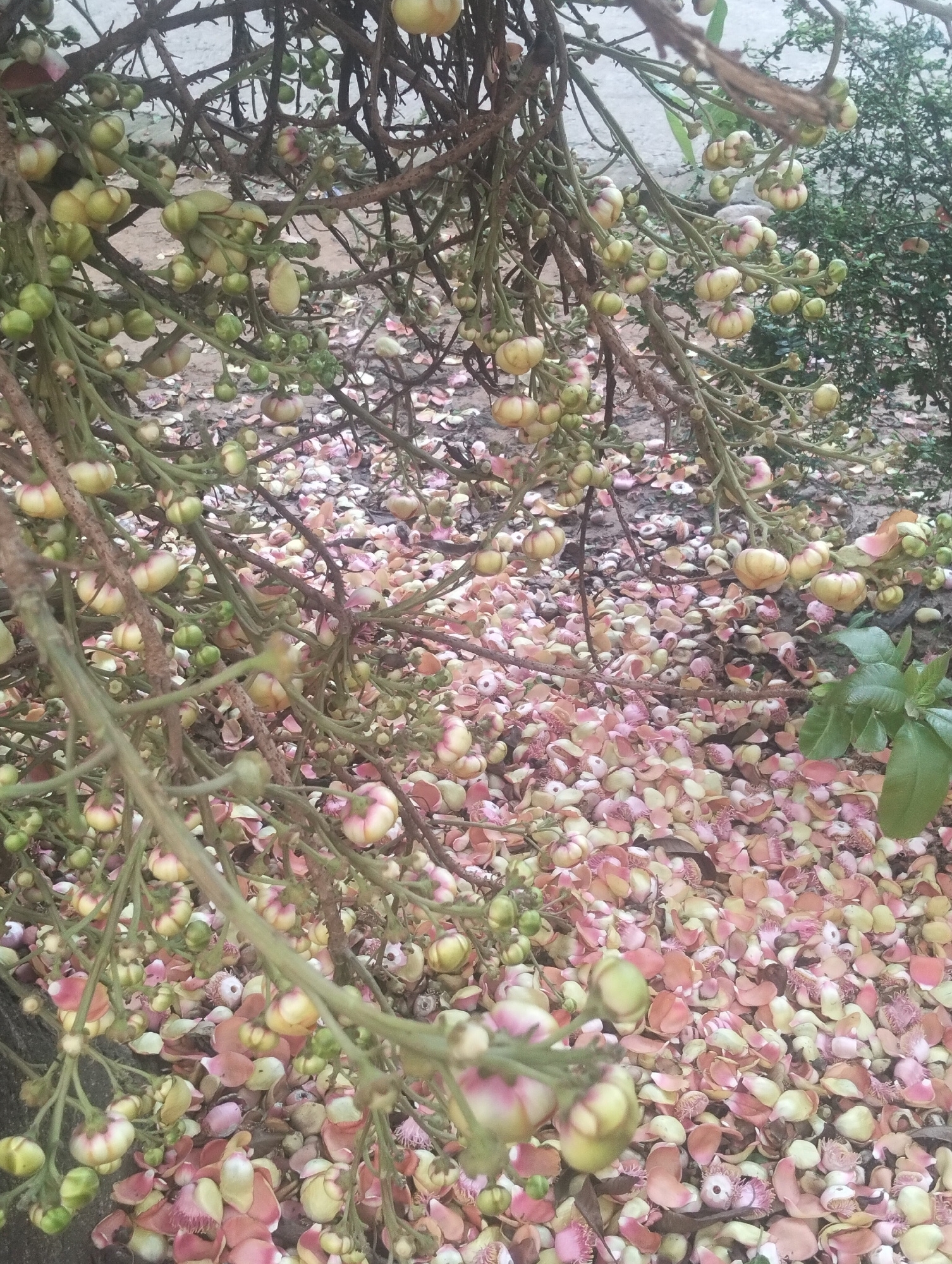 The image shows a close-up view of a cannonball tree (Couroupita guianensis) in bloom, likely located in Dhaka, Bangladesh. The tree's branches are laden with spherical, green and light yellow fruit-l…read more