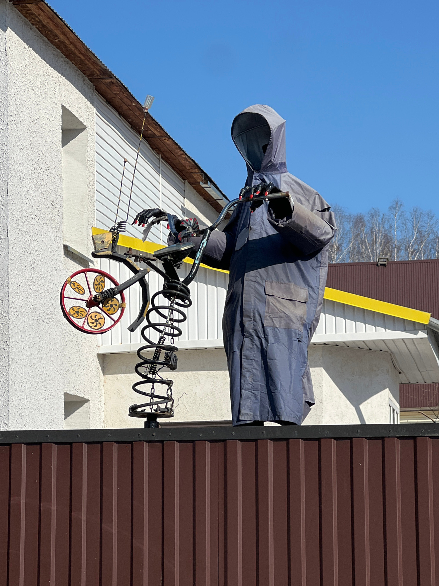 A roadside sculpture depicting a grim reaper on a bicycle is mounted on the side of a building. The grim reaper is fashioned from a dark-colored garment with a hood, obscuring any facial features. The…read more