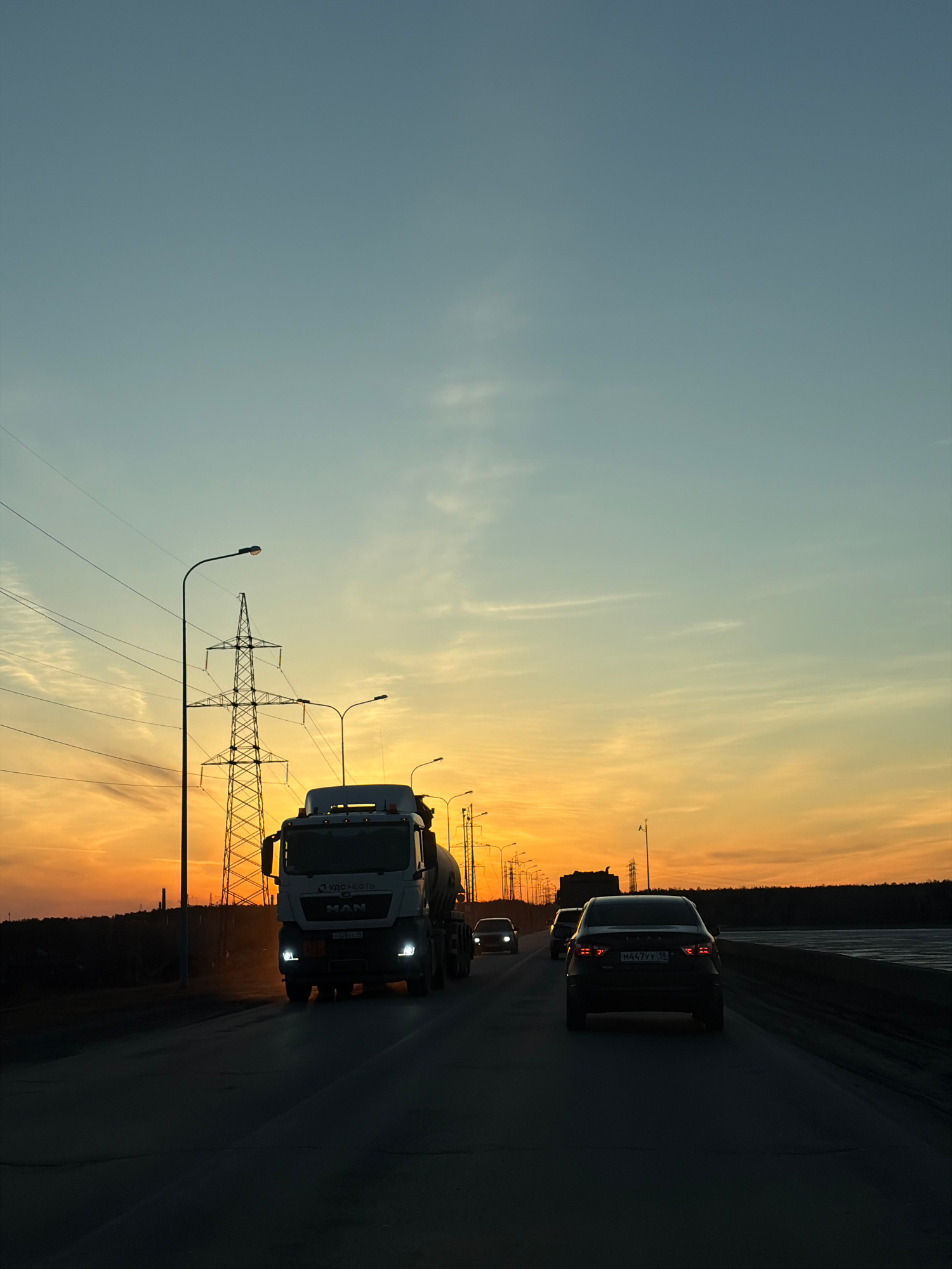 The image shows a road with vehicles at dusk or dawn in Chaikovsky, Russia. A large white MAN truck is traveling towards the viewer, with its headlights illuminated. Behind it, several other vehicles,…read more