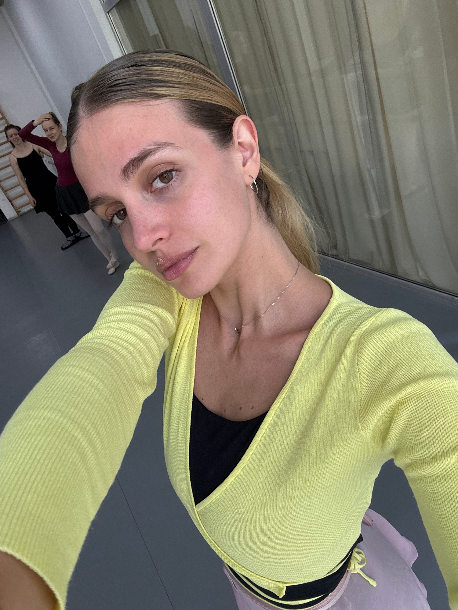 A selfie taken in what appears to be a dance studio. The subject is a woman with blonde hair and brown eyes, wearing a light yellow long-sleeved wrap sweater over a black top, and a light pink skirt t…read more