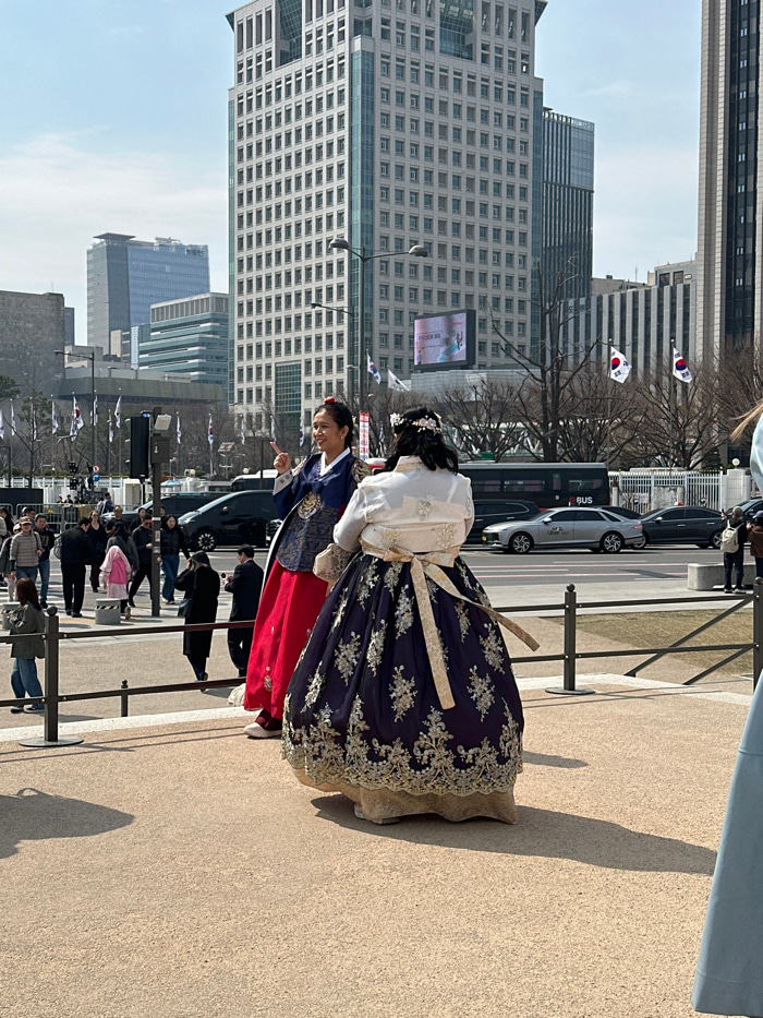 The image depicts an outdoor urban scene on a clear, sunny day in Seoul, South Korea, specifically in an open public area adjacent to the Seoul Metropolitan Government Building and Seoul Plaza. In th…read more