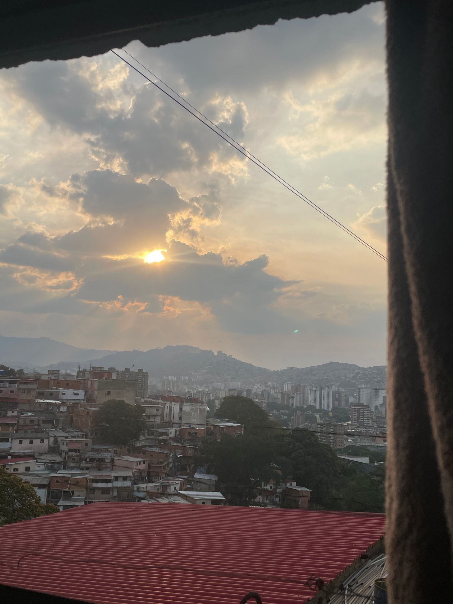 The image depicts a hazy sunset over a densely populated urban area, likely a hillside neighborhood in Caracas, Venezuela. The view is framed by a window or opening. In the distance, tall buildings ca…read more