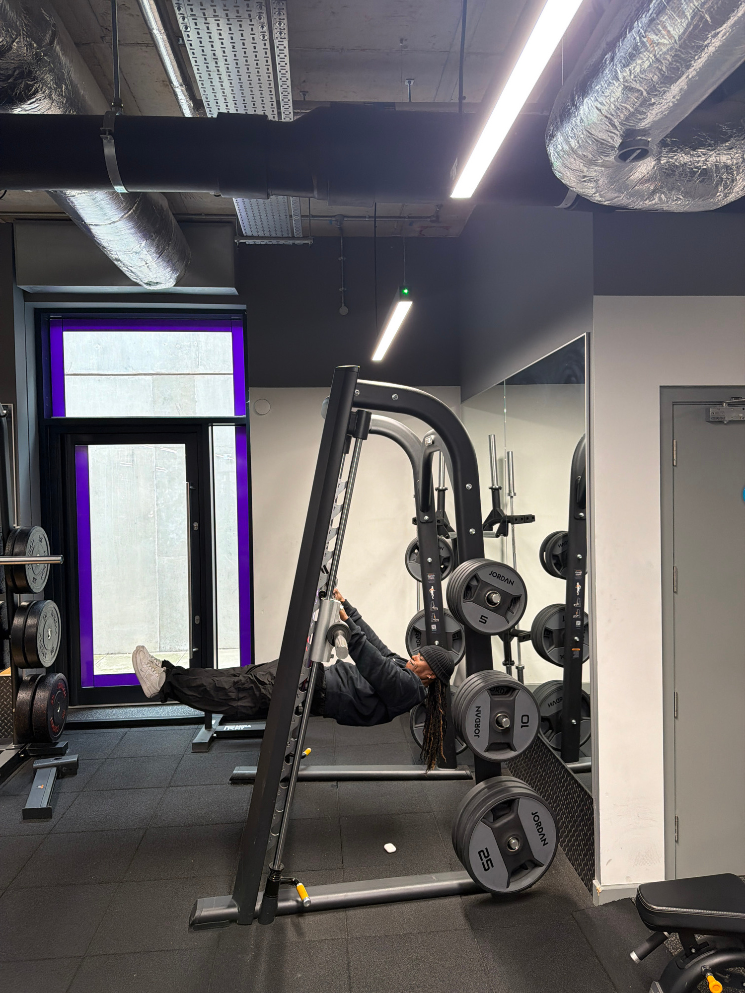 This full-shot image displays a modern gym interior, with the original image rotated 90 degrees clockwise. In the foreground, a person wearing a dark beanie, a black jacket, dark pants, and white snea…read more