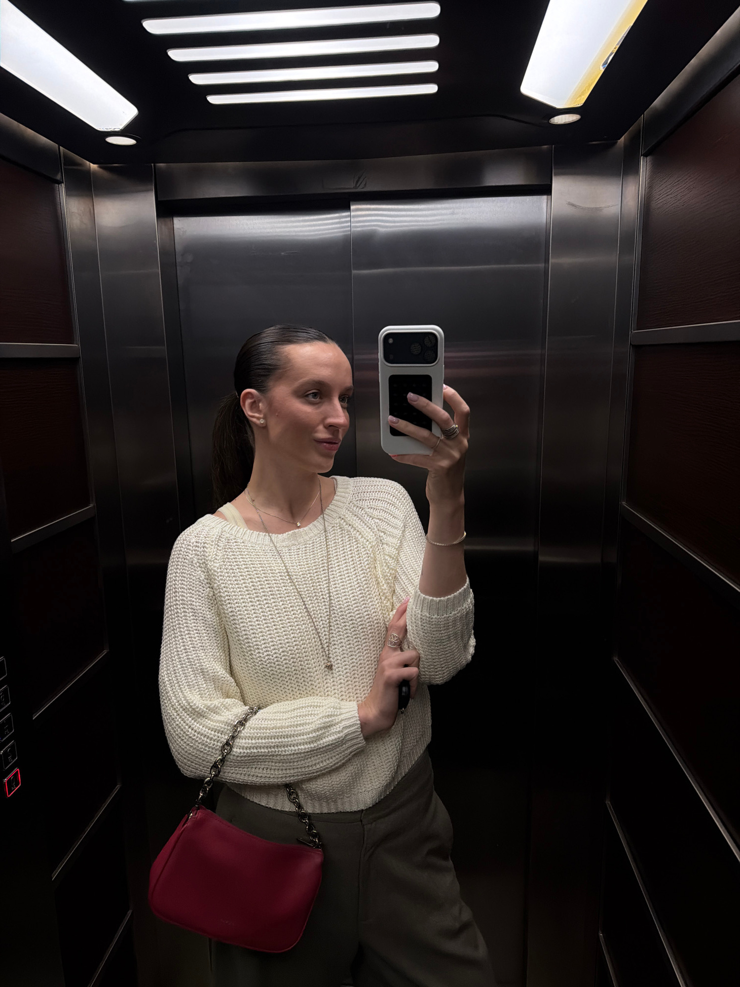 A woman is taking a selfie inside an elevator. She is fair-skinned, wearing a white knit sweater, grey pants, a silver necklace, and several rings. She is holding a white smartphone with a black scree…read more