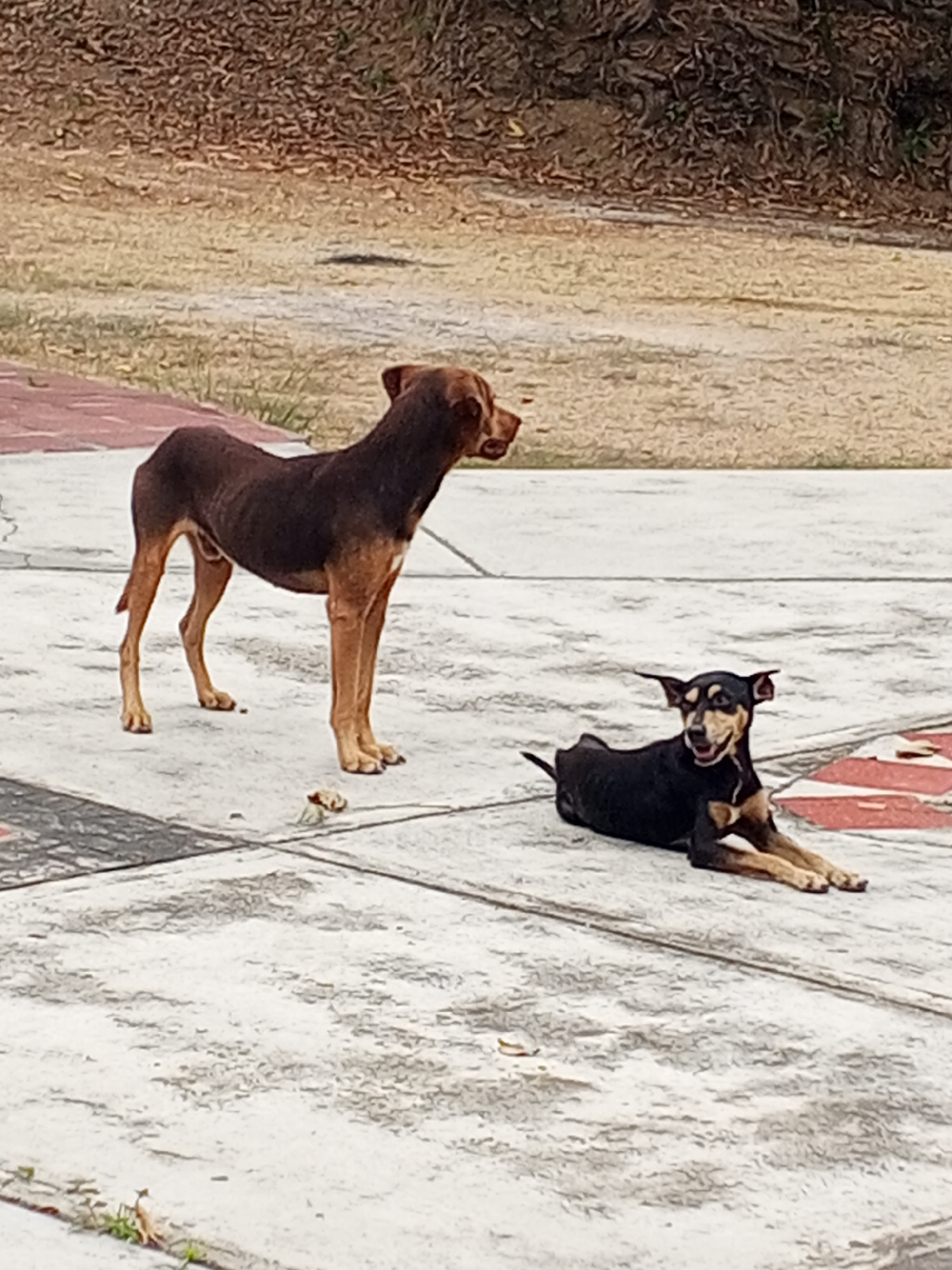 The image depicts two dogs on a concrete surface, likely a patio or public space, located in Tinaquillo, Venezuela. The first dog is brown and lean, standing on four legs. The second dog is black withβ¦read more