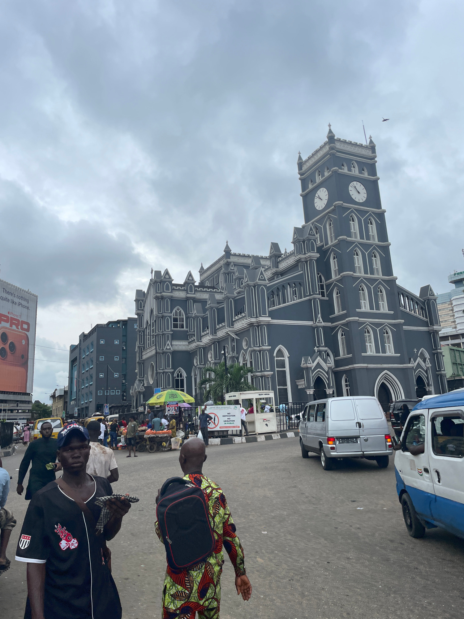 The image depicts a street scene in Lagos, Nigeria, with the Cathedral Church of Christ prominently featured. The cathedral, a large grey building with white trim and a clock tower, dominates the back…read more