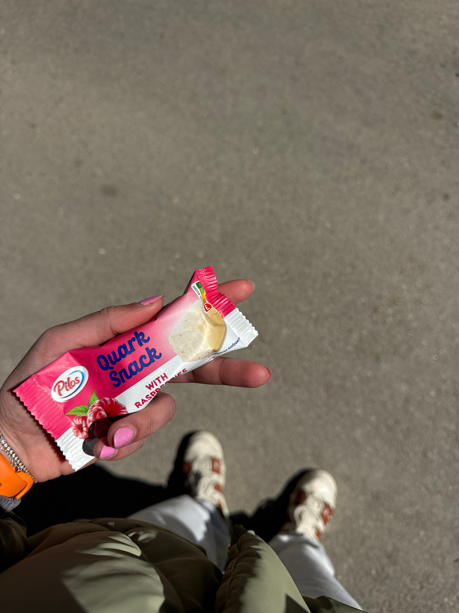 The image shows a person holding a "Quark Snack with Raspberries" bar, branded "Plus." The bar is pink and white with an image of a raspberry. The person's hand has pink nail polish, and they are wear…read more