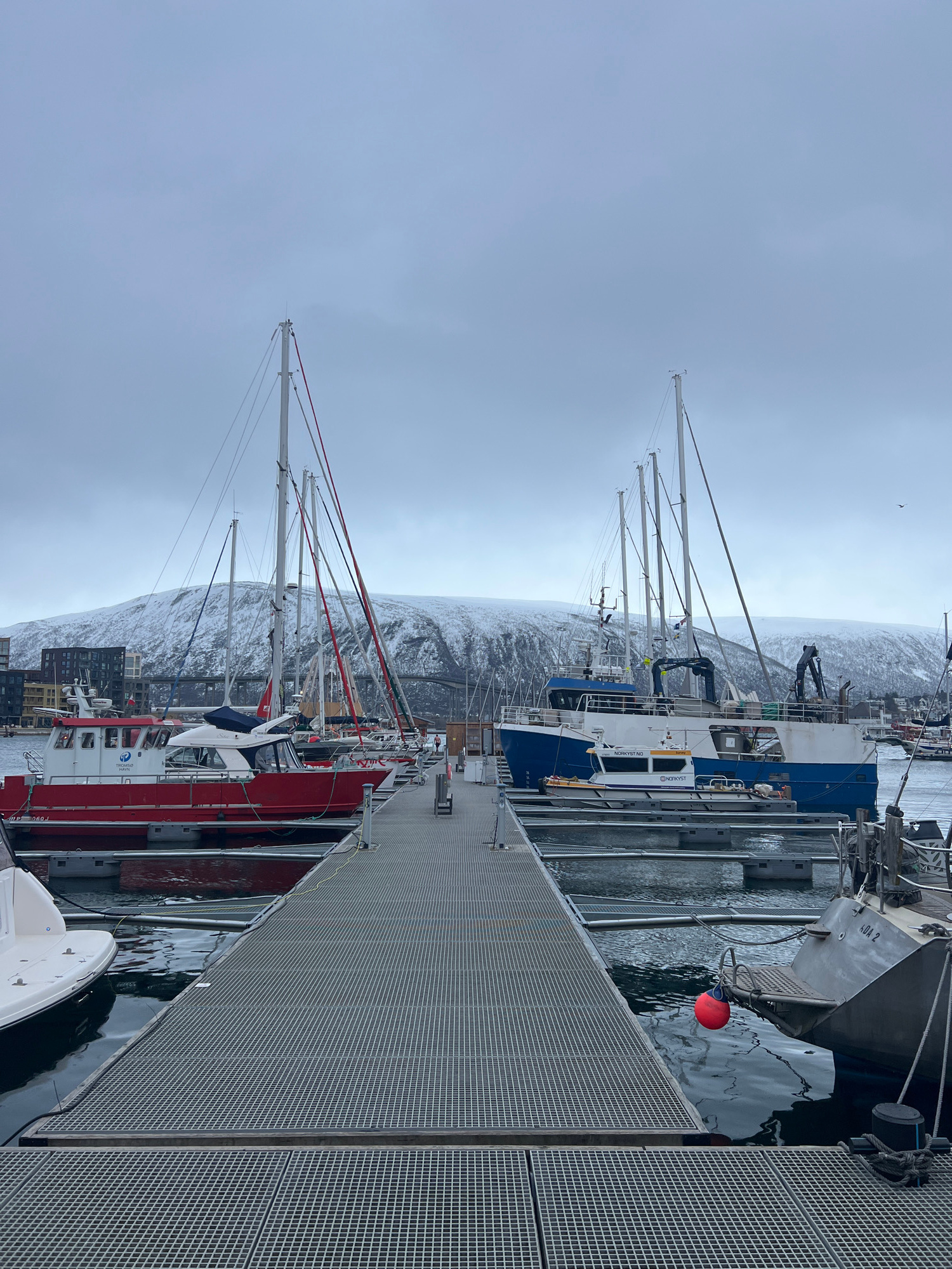 The image depicts a harbor in Tromsø, Norway, during what appears to be winter or a cold season, with snow-covered mountains in the background. The foreground features a metal grid pier alongside dock…read more