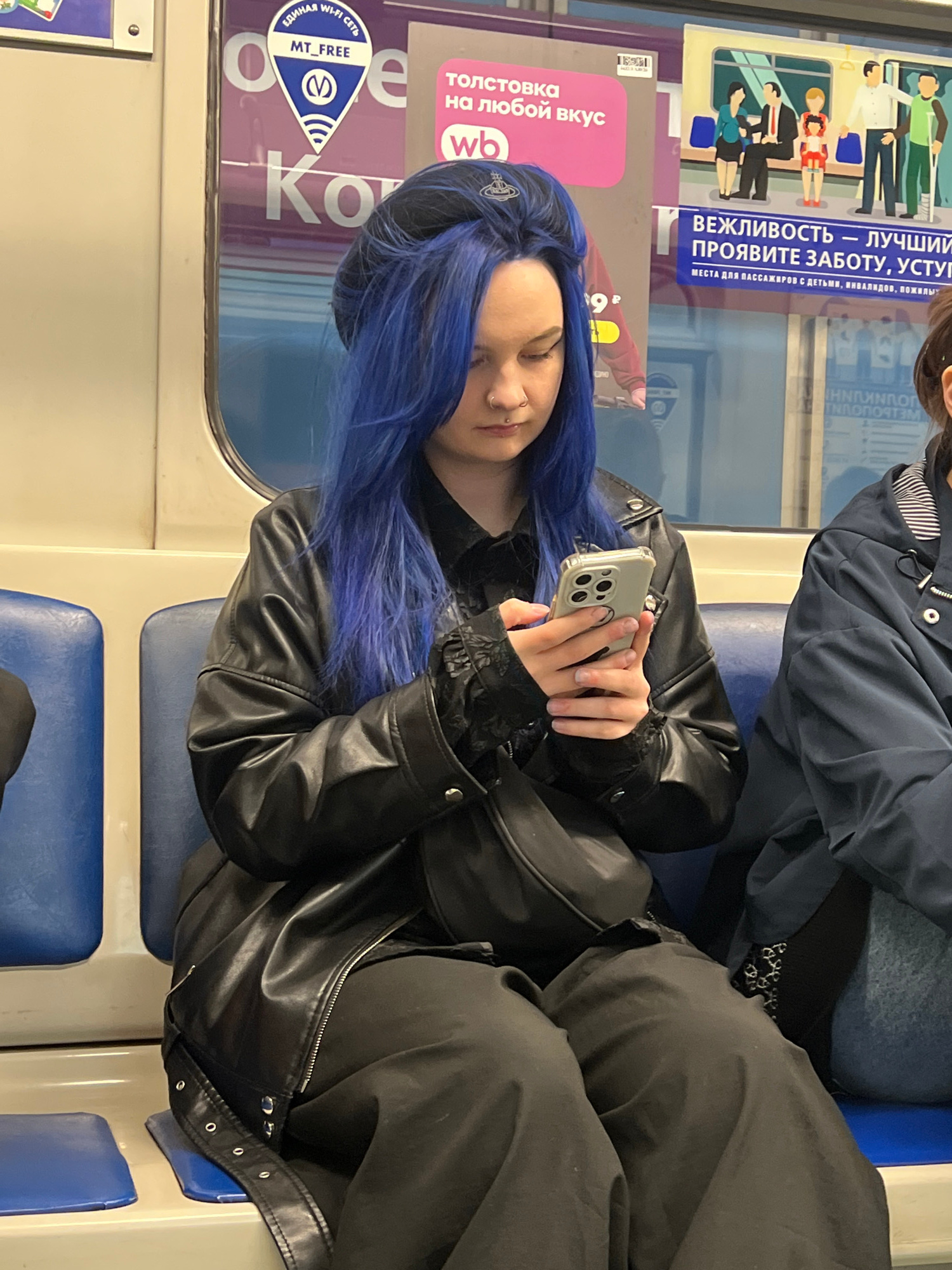 A woman with dyed blue hair is sitting on a blue seat in the Saint Petersburg, Russia metro while looking at her cell phone. She is wearing a black leather jacket and black pants. Next to her, another…read more