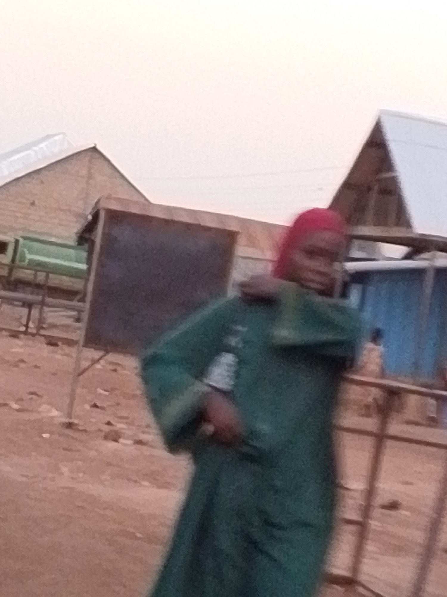 A blurred photograph shows a person in Tamale, Ghana wearing a green robe and red head covering. The person is standing in a dirt area in front of some simple buildings, with a chalkboard on legs. The…read more