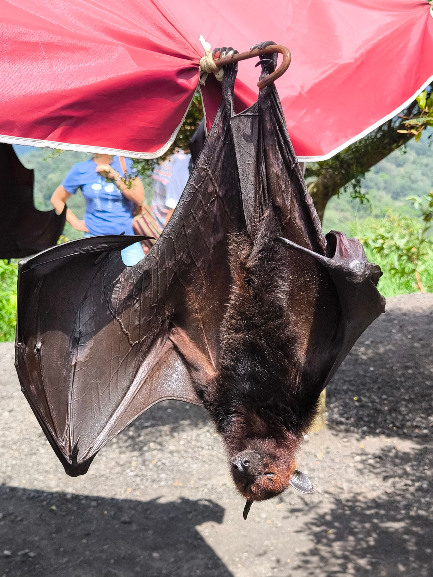 A large, dark-furred bat hangs upside down, suspended by its feet from a curved metal hook attached to a red canopy. The bat's wings are partially unfurled, revealing their dark, leathery texture. In…read more