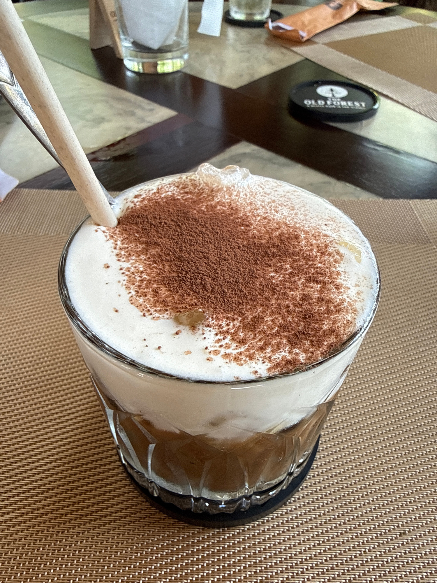 The image displays a close-up, high-angle view of an iced beverage on a table, captured in Phú Quốc, Vietnam. The central object is a tall glass of a brown-colored drink, likely iced coffee, generousl…read more