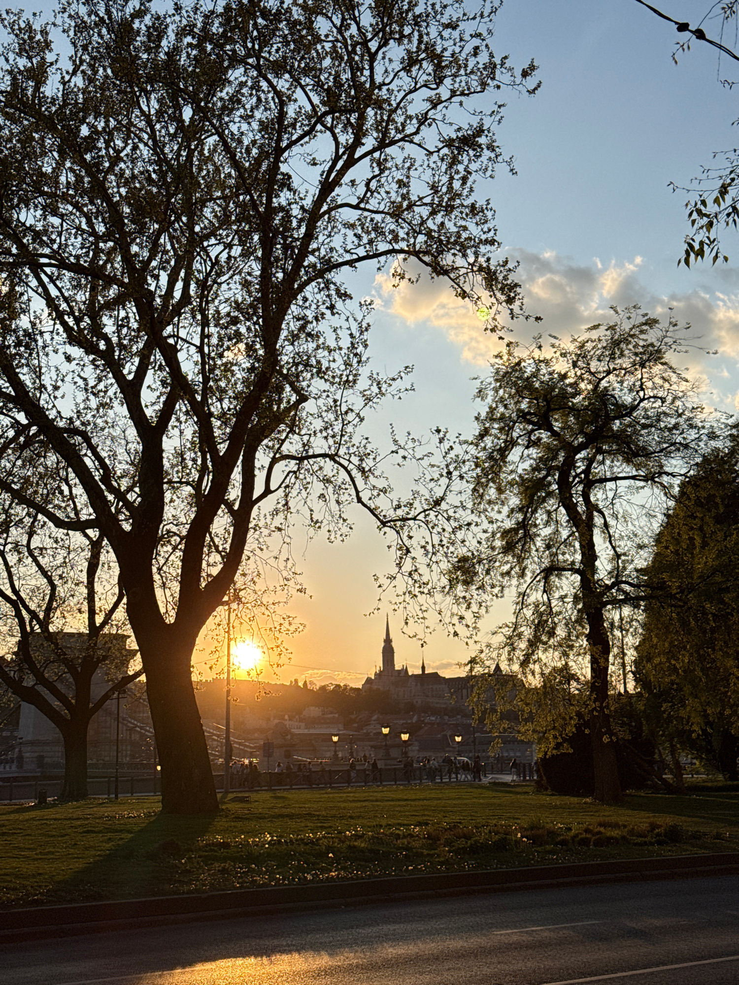 The image depicts a sunset view in Budapest, Hungary, framed by trees in the foreground. The sky is a mix of blue and orange hues, with clouds scattered across. In the distance, the silhouette of theβ¦read more