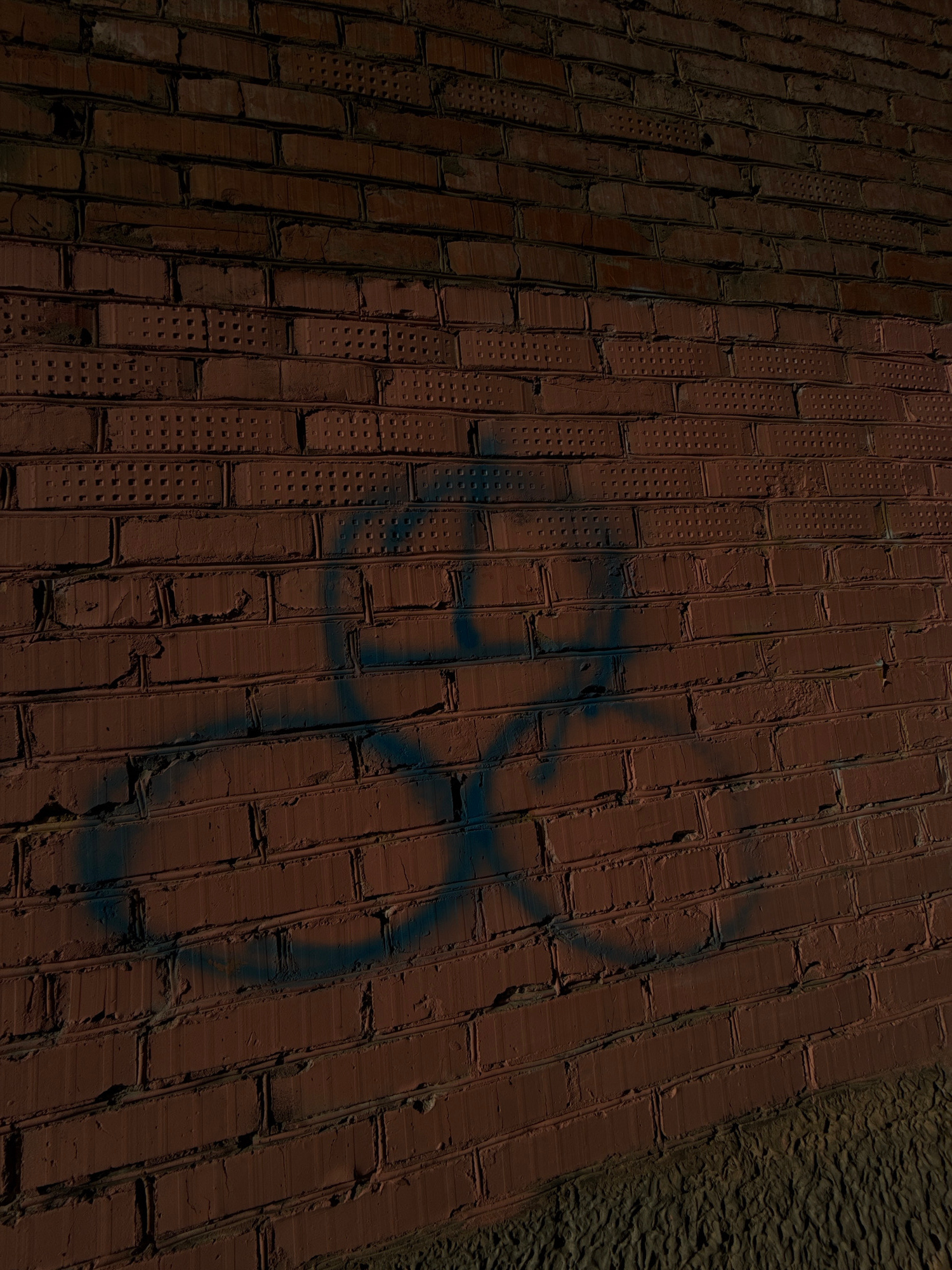 The image depicts a section of a brick walkway or path. The bricks are reddish-brown and have a textured surface. Spray-painted in blue on the bricks is what appears to be a swastika. The scene appear…read more