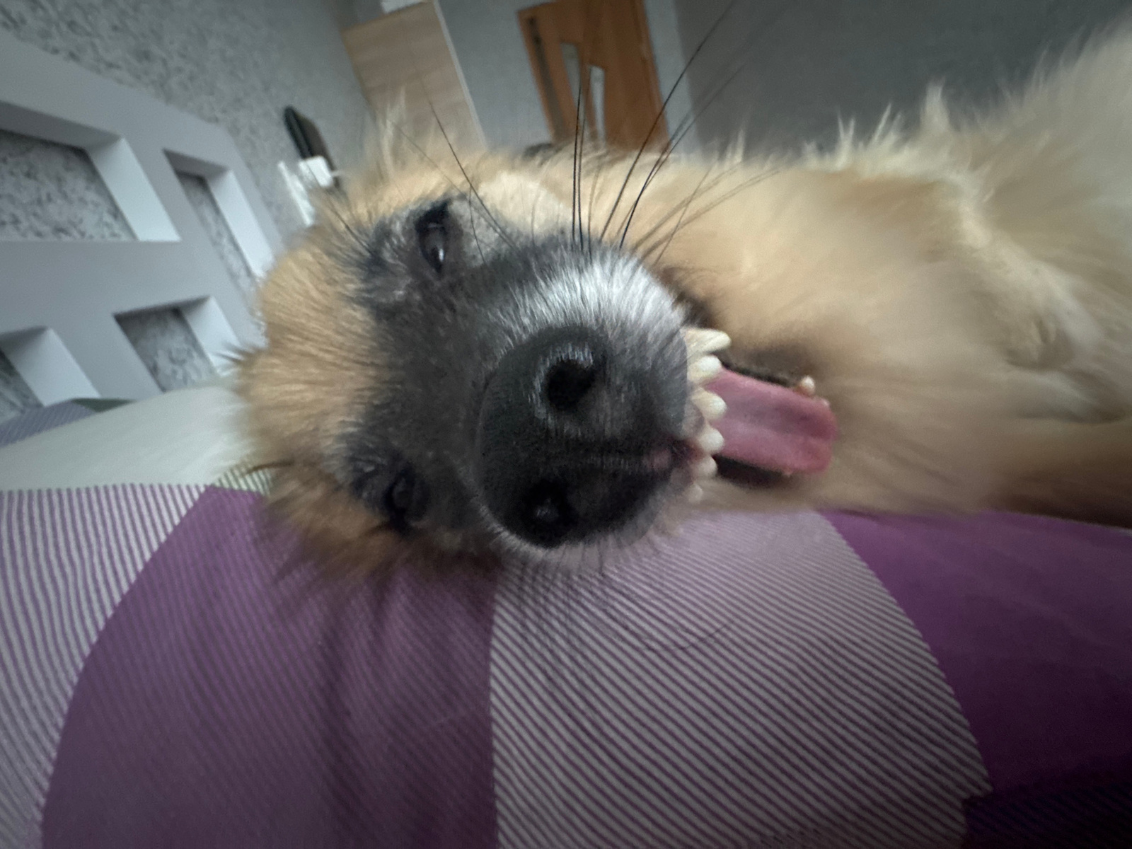 A tan, medium-sized dog with a dark muzzle and whiskers is lying on its back on a bed with a striped purple and white cover. The dog's tongue is visible, protruding from its mouth. A white headboard w…read more