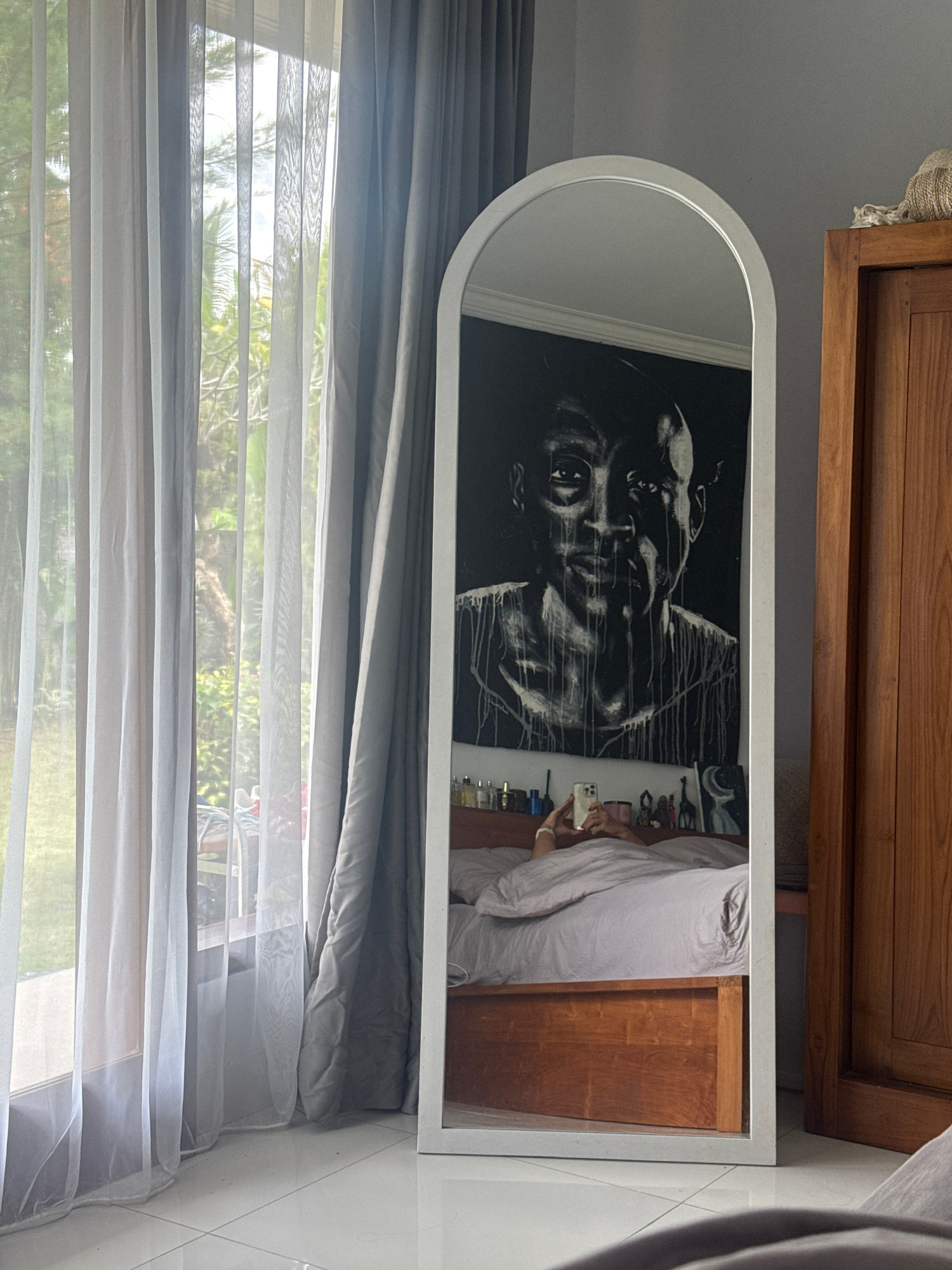 The image shows a mirror reflecting a bedroom scene in Tampaksiring, Indonesia. The mirror is oval-shaped with a white frame and is positioned in front of a window covered with gray and white transluc…read more