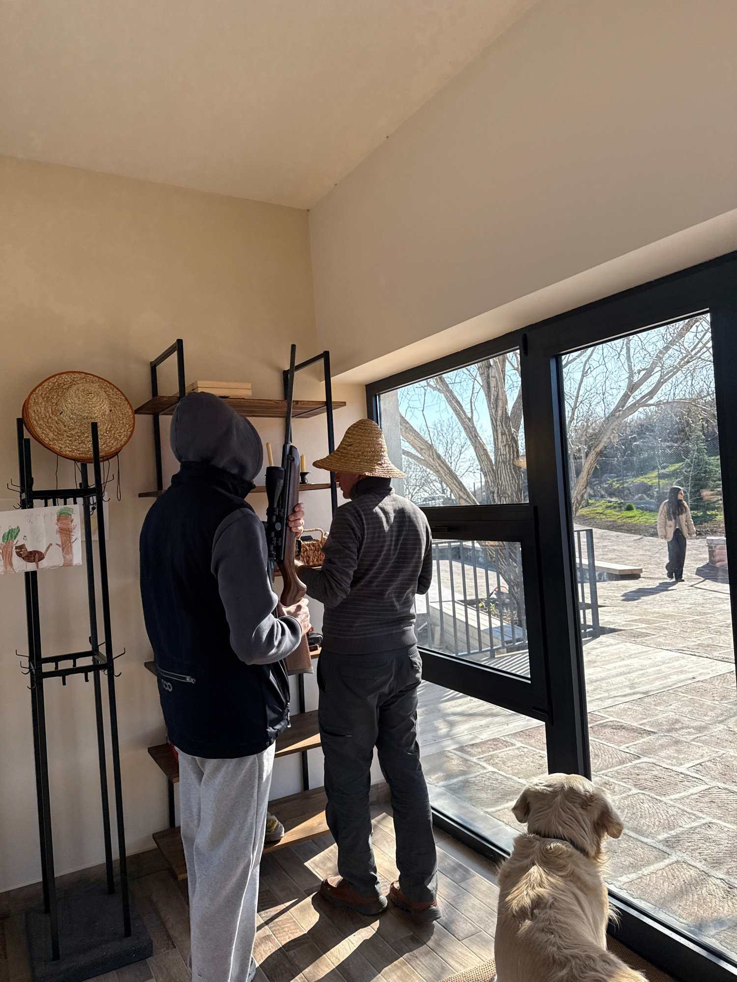 The image captures an indoor scene looking out through a large, modern window into a sunlit outdoor area. Two individuals are inside, along with a dog. One person, wearing a dark hoodie and light grey…read more
