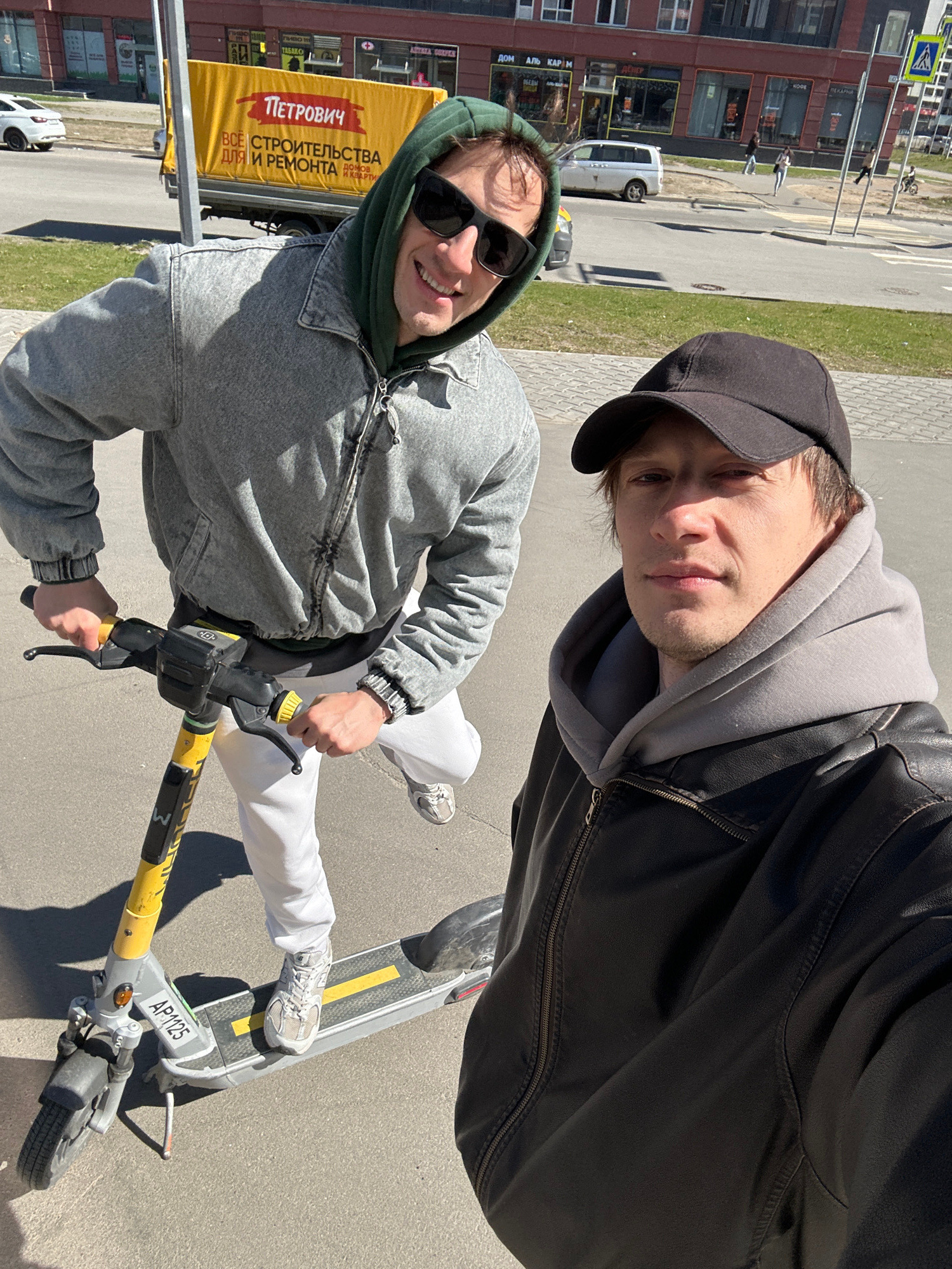 Two young men are taking a selfie while riding an electric scooter on a street in Murino, Russia. The man on the left is wearing sunglasses, a gray hoodie, and a denim jacket. The man on the right is…read more