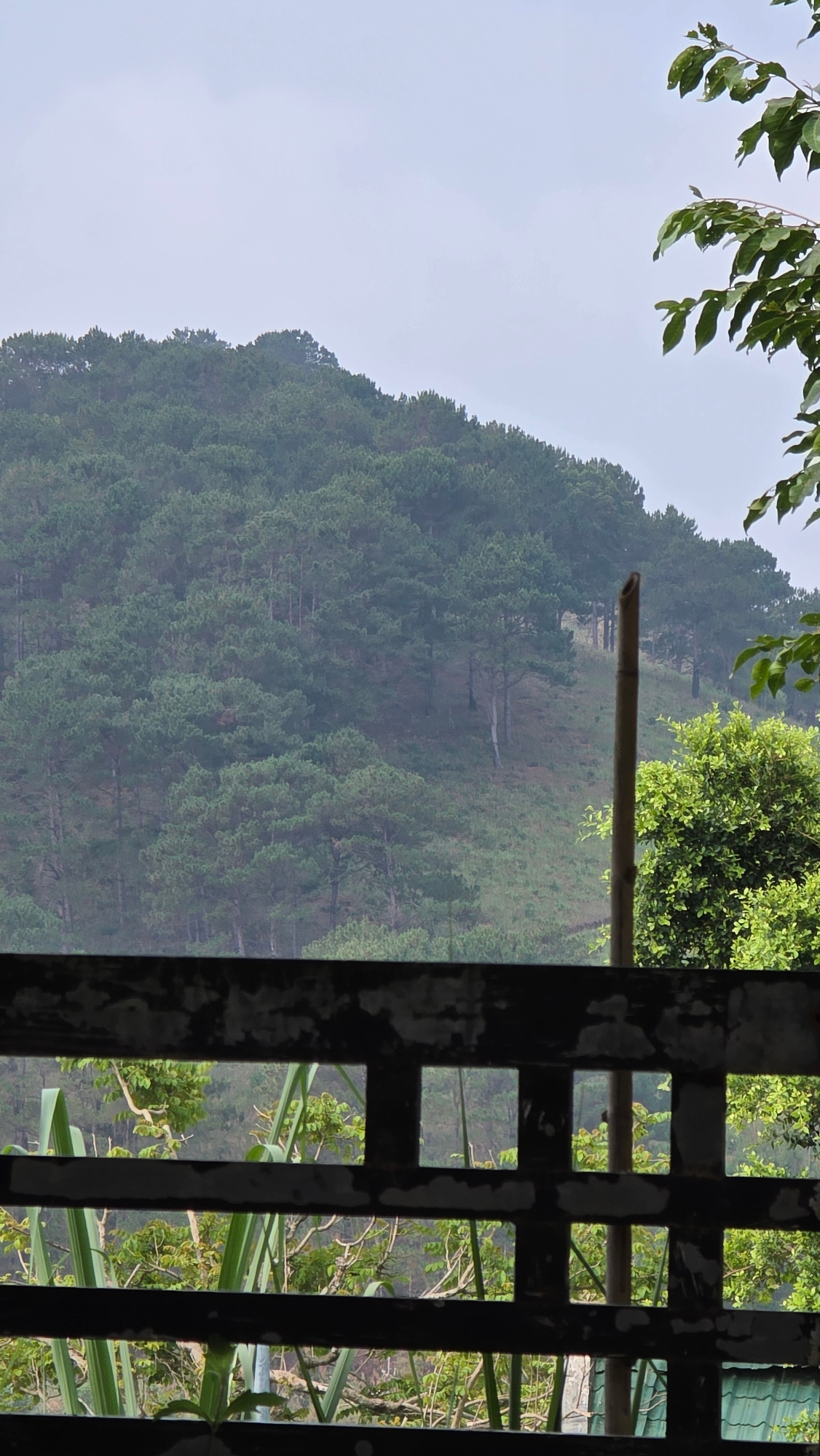 A low-angle shot of a hillside in Bờ Y, Vietnam, possibly from a veranda or porch. The hillside is covered with a dense forest of evergreen trees. The foreground features a dark, lattice-style railing…read more