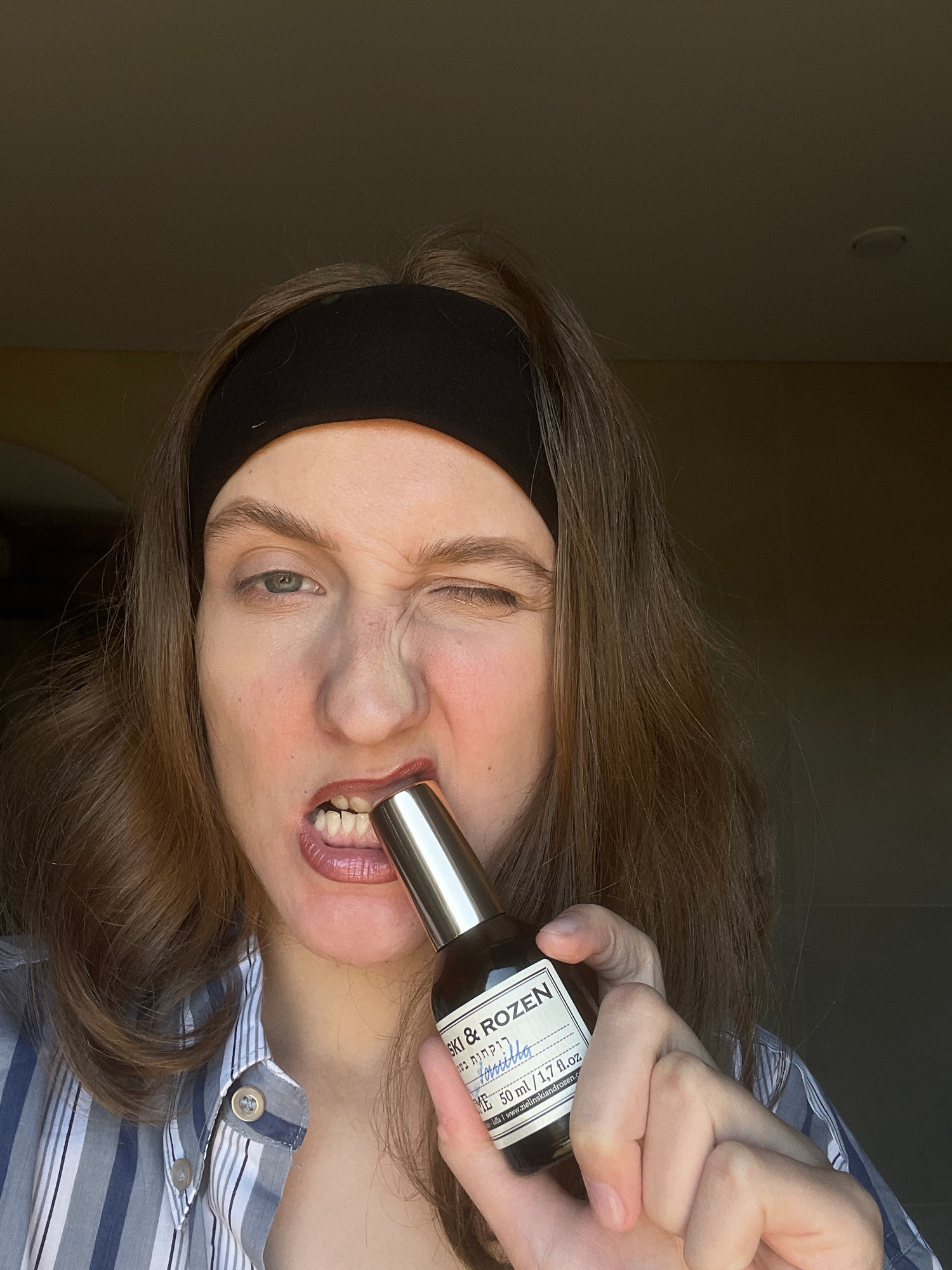 A woman with light skin, brown hair, and a black headband is holding a bottle of "SKI & ROZEN Vanilla ME" in her teeth. She is wearing a blue and white striped shirt. The background appears to be an i…read more