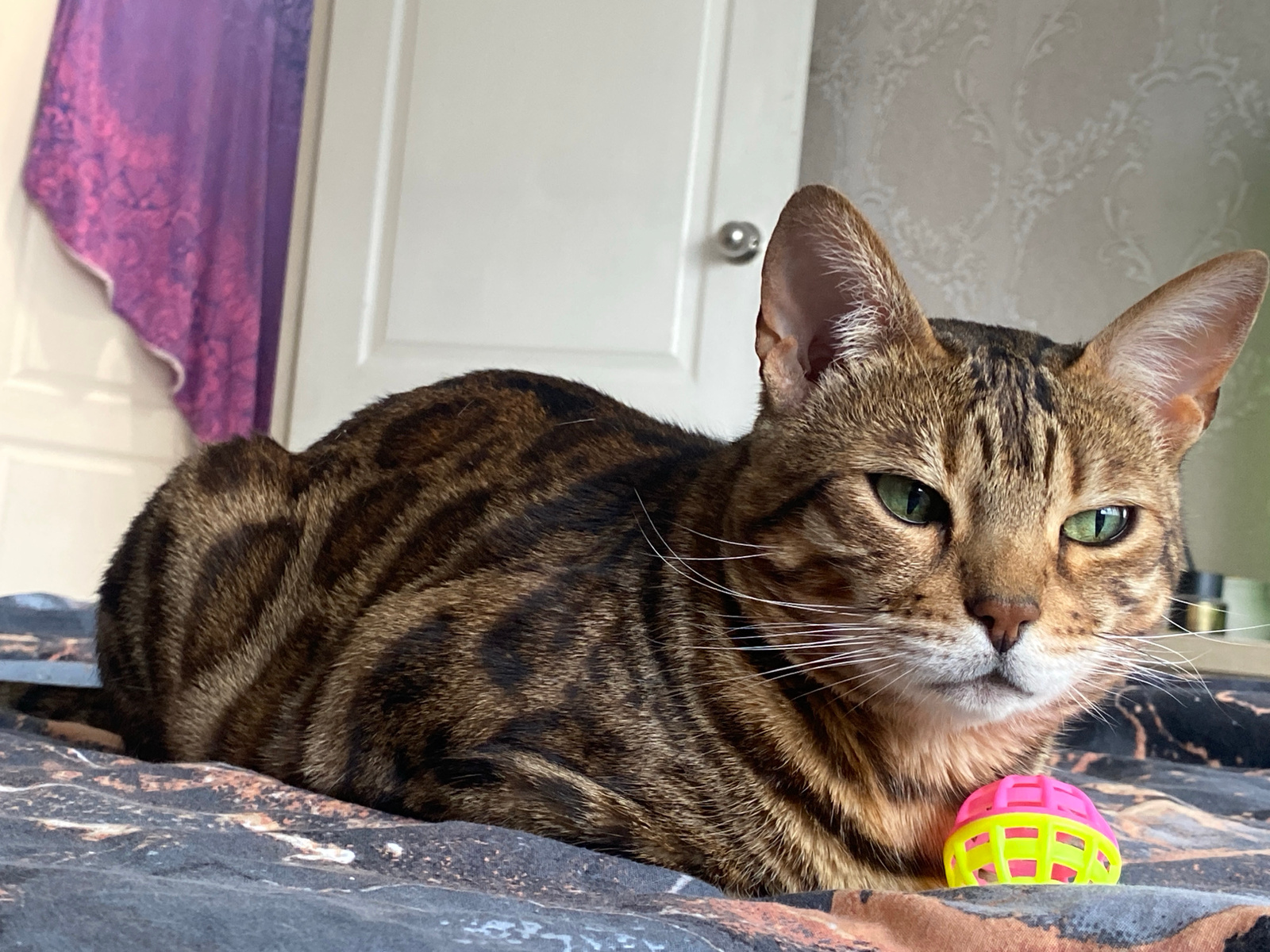 A Bengal cat lies on a bed with a pink and yellow plastic ball in front of it. The cat has green eyes, brown and black striped fur, and white whiskers. Behind the cat are a closed white door with a si…read more
