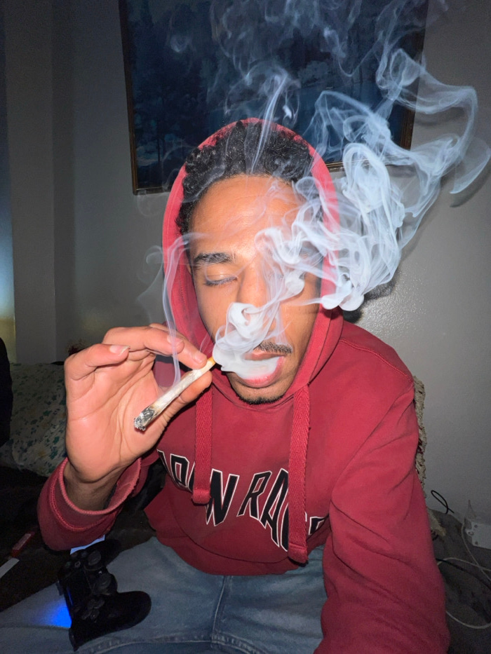 A male individual with dark, curly hair and a mustache is depicted in an indoor setting in Tanger, Morocco. He is wearing a red hooded sweatshirt with white text on the front and blue denim jeans. His…read more