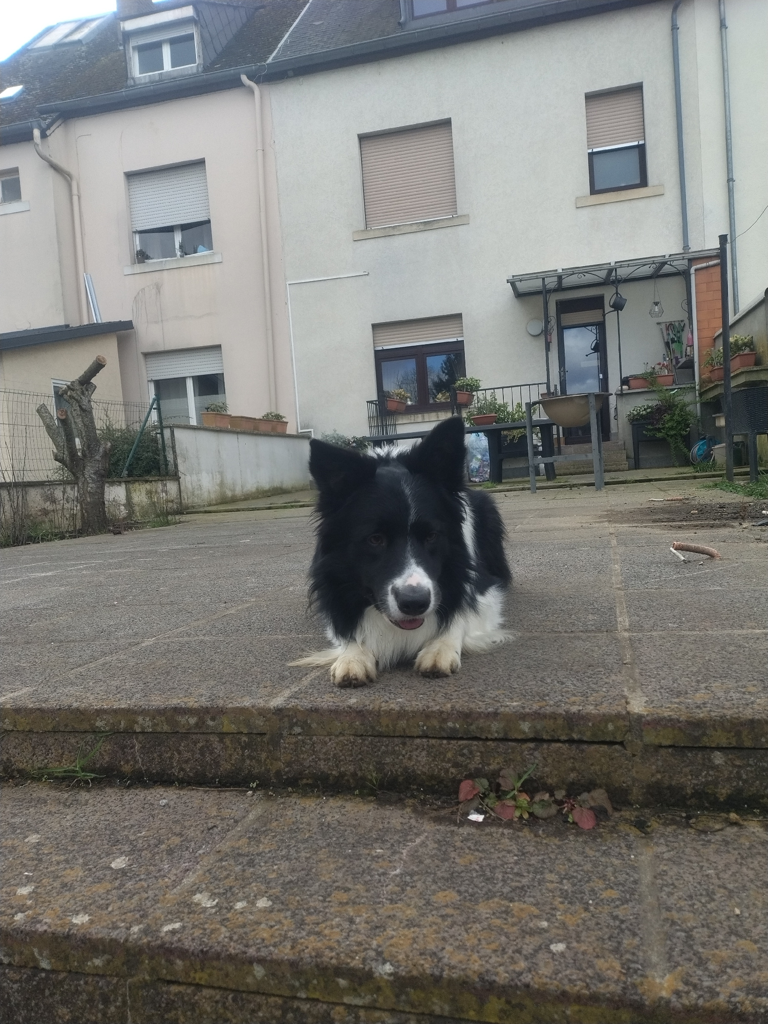 The image shows a black and white Border Collie dog lying on a paved area next to a low, mossy wall. The dog has its tongue slightly out. Behind the dog is a light-colored building with multiple windoβ¦read more