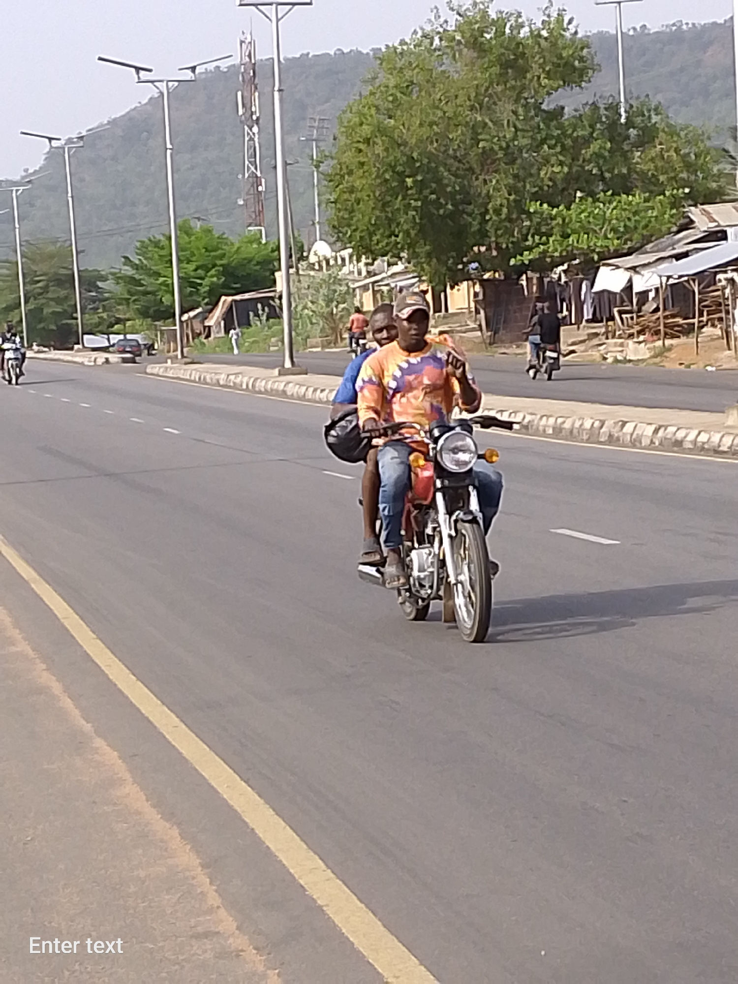 The image depicts a street scene in Adankolo, Nigeria. Two individuals are riding a red motorcycle on a paved road. The driver is wearing a colorful shirt, jeans, and a baseball cap, while the passeng…read more