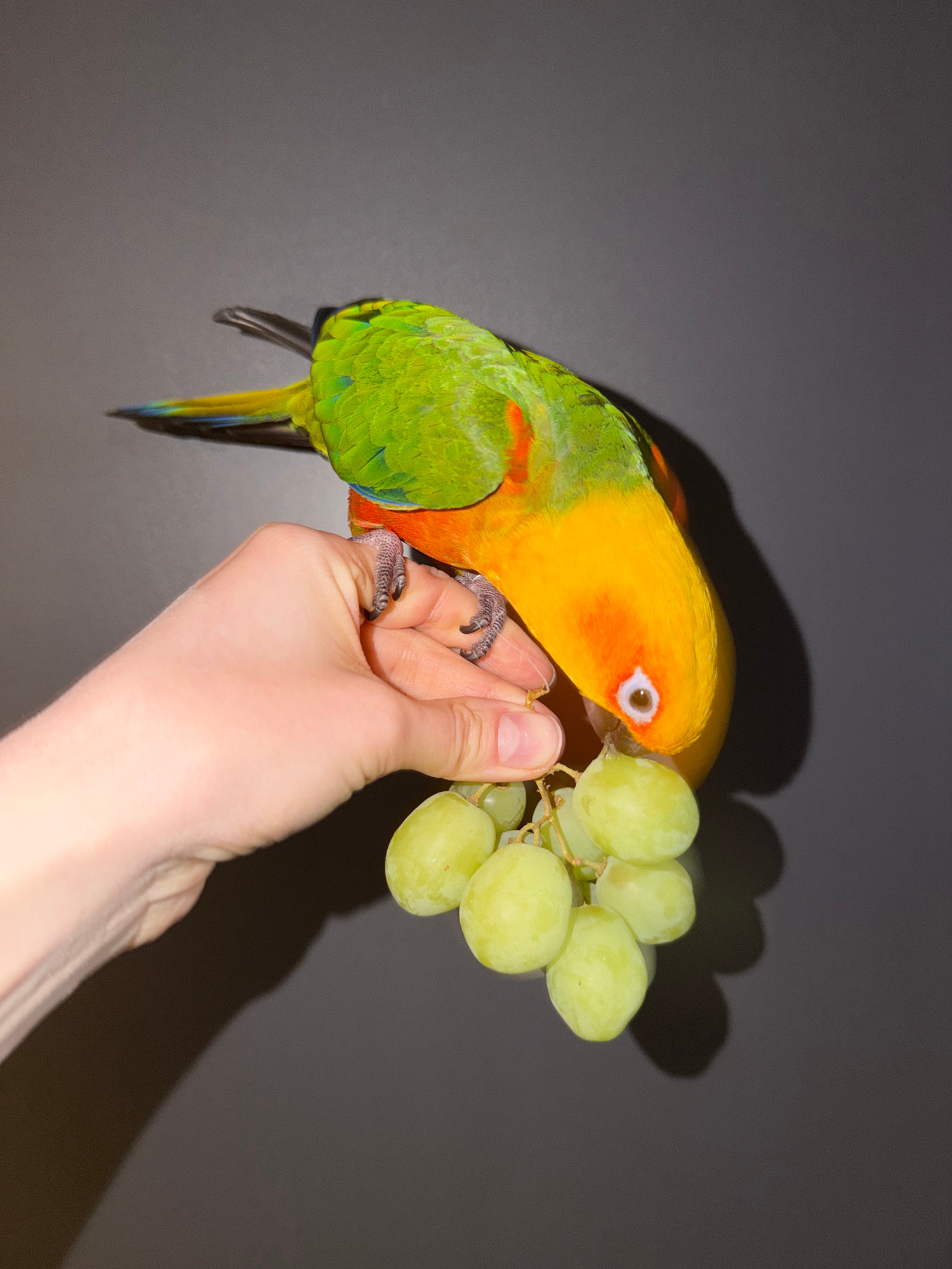 A Sun Conure parrot is perched on a person's hand while eating green grapes. The parrot's head is mostly yellow, transitioning to green on its body, with some orange patches. It is facing the grapes,…read more