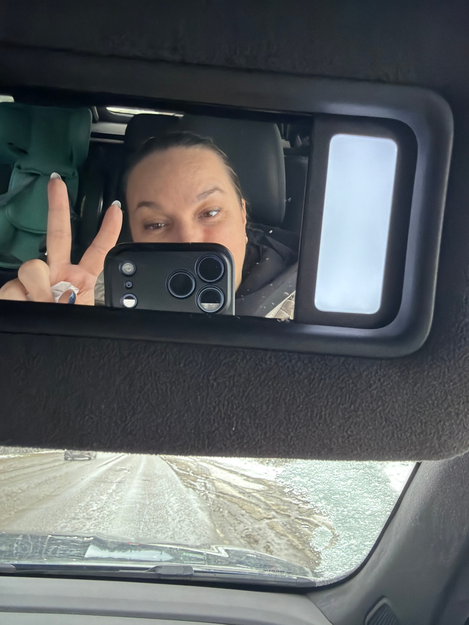 The image shows a selfie taken in the mirror of a vehicle. The mirror is positioned on the sun visor. In the reflection, a person is visible holding a phone with multiple camera lenses. The person is…read more