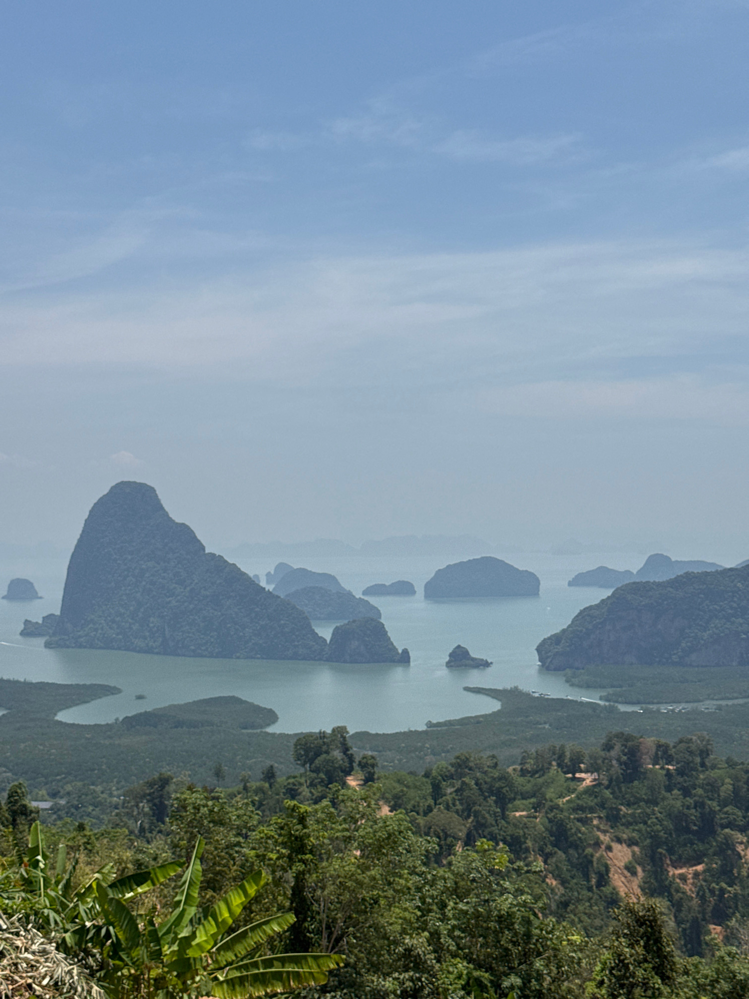 The image shows a landscape in Ban Khlong Khian, Thailand, featuring a bay dotted with limestone karst formations. The water is a light green-grey color. Lush green vegetation covers the edges of the…read more